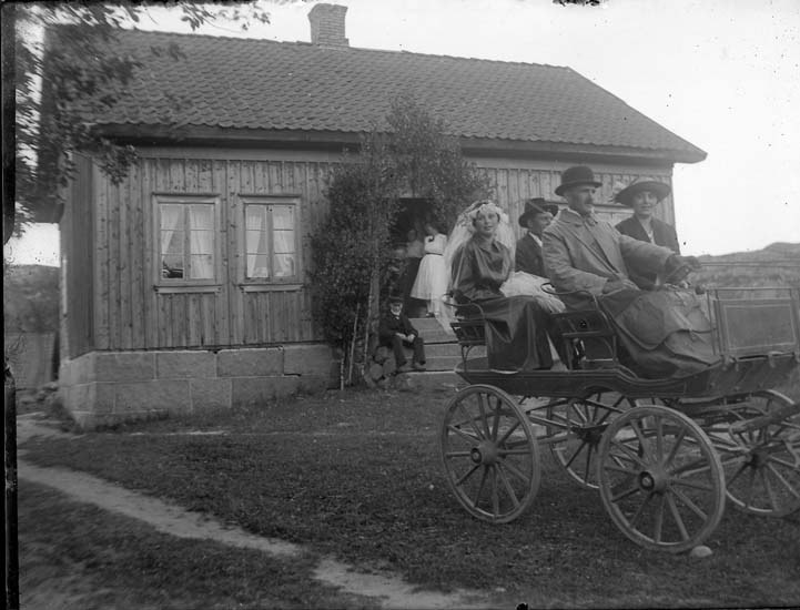 Enligt notering: "Bröllopet i Bärby 3 juni 1921. Två par i vagnen. Anders Andersson o Ester".