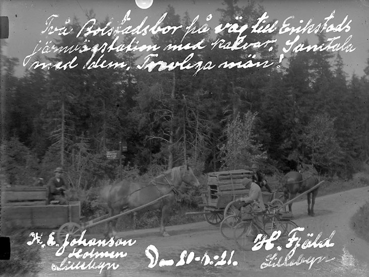 Enligt text på fotot: "Två Bolstadsbor på väg till Erikstads järnvägsstation med kalvar. Samtala med dem. Trevliga män. H.E. Johansson Holmen Lillebyn. H. Fjäld Lillebyn. Den 20621".