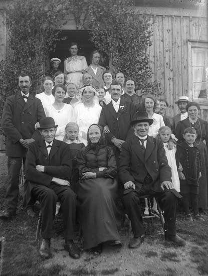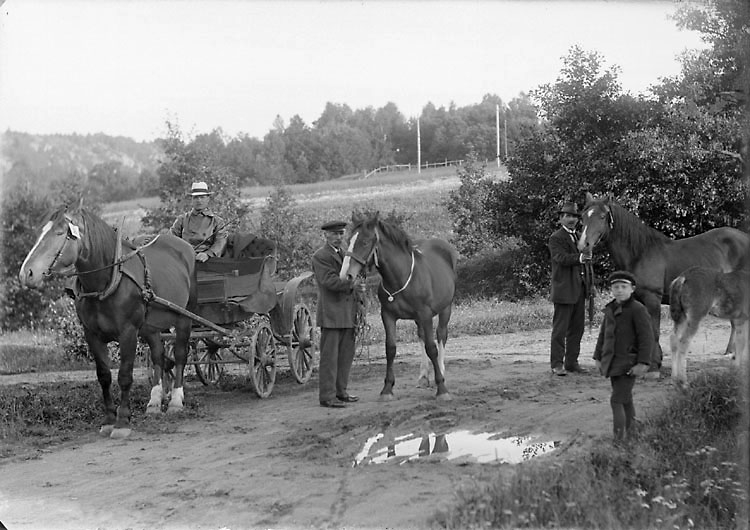 Enligt senare noteringar:"14 juni 1921. Beställare till fotografering var Johansson i Hogen, troligen Håby socken. Bilden är tagen utanför Oscar Färdigs fastighet vid Kvistrum." (BJ)