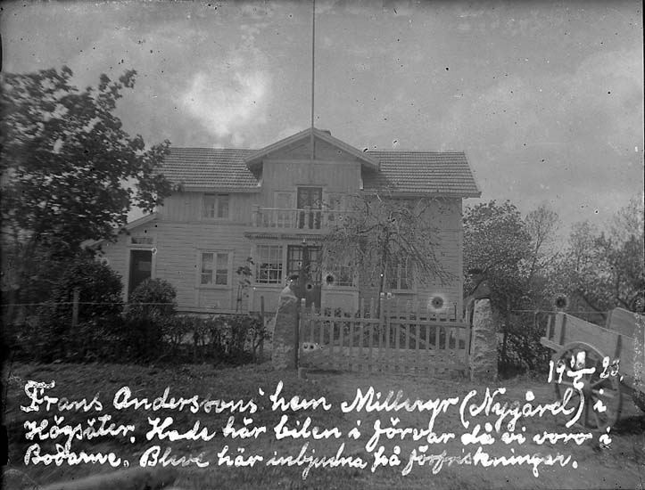 Enligt text på fotot: "Frans Anderssons hem Milleryr (Nygård) Högsäter. Hade här bilen i förvar då vi voro i Bodarne. Blev här inbjudna på förfriskningar. 18/6 1923".
