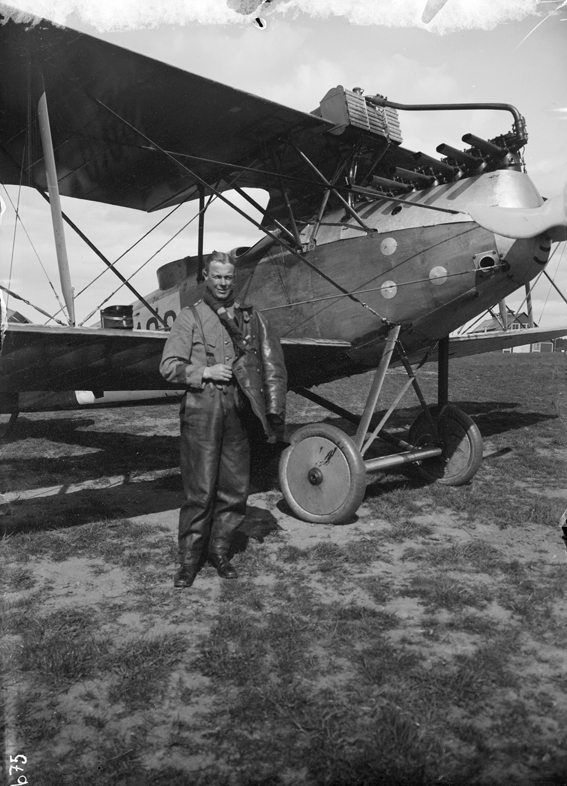 Porträtt av löjtnant framför flygplan FVM S 18 flygplan efter en 13 h långflygning.