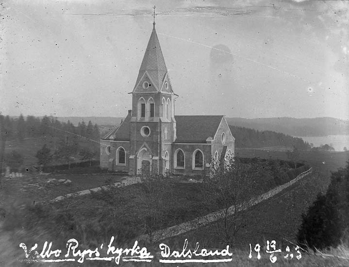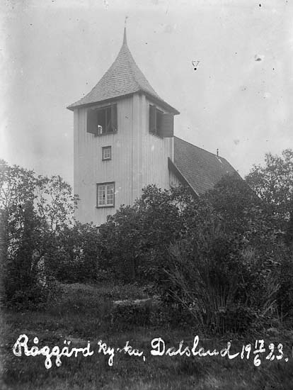 "Järbo kyrka. Här i förgrunden x hade klockstapeln stått vilken nedbrann för 3 år sedan. Vi voro på högmässan här, vilken förrättades av pastor Derin 17 juni 1923" enligt text p&ari