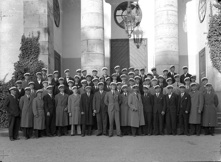 Uppgift enligt fotografen: "Uddevalla. Sångsällskapet Vikingarna på kyrktrappan."