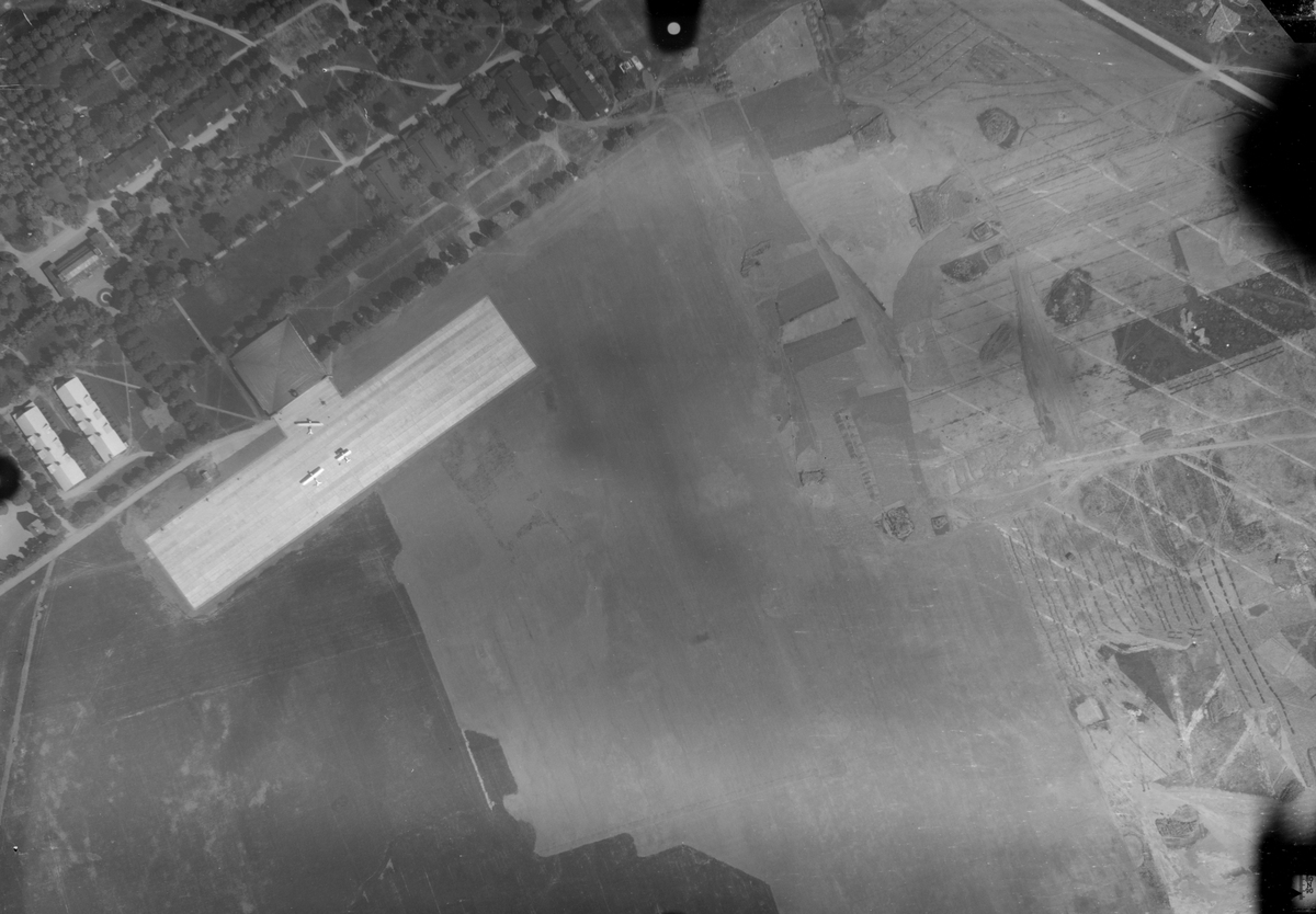 Flygfotografi av flygfältet vid F 3 Malmen; norra hangaren, 1936. Från 2500 meters höjd.