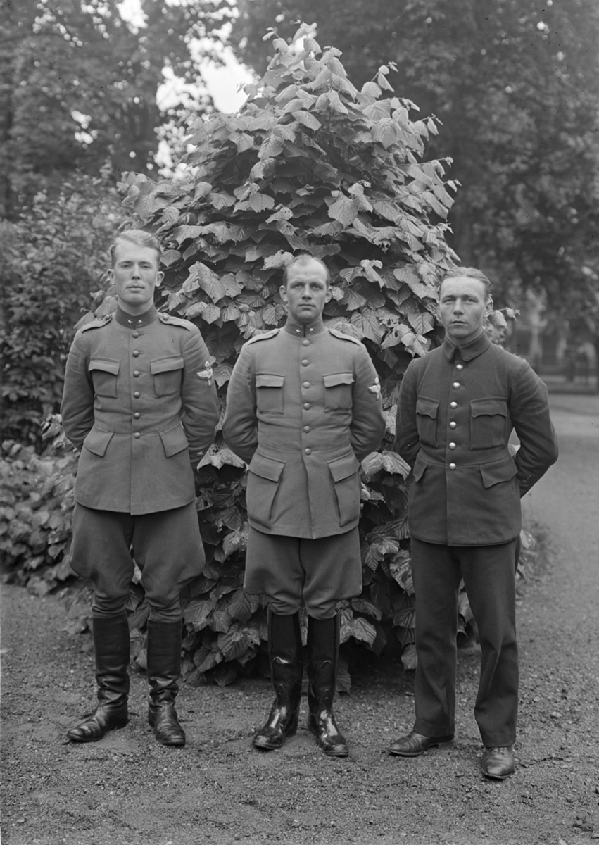 Grupporträtt av löjtnanterna Bengt Weman, Lars Horn och Per Sterner, militära flygförare och flygspanare.