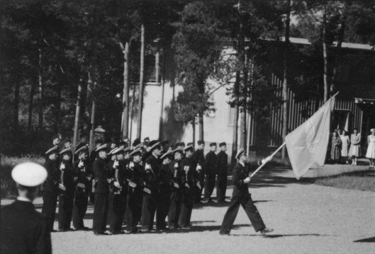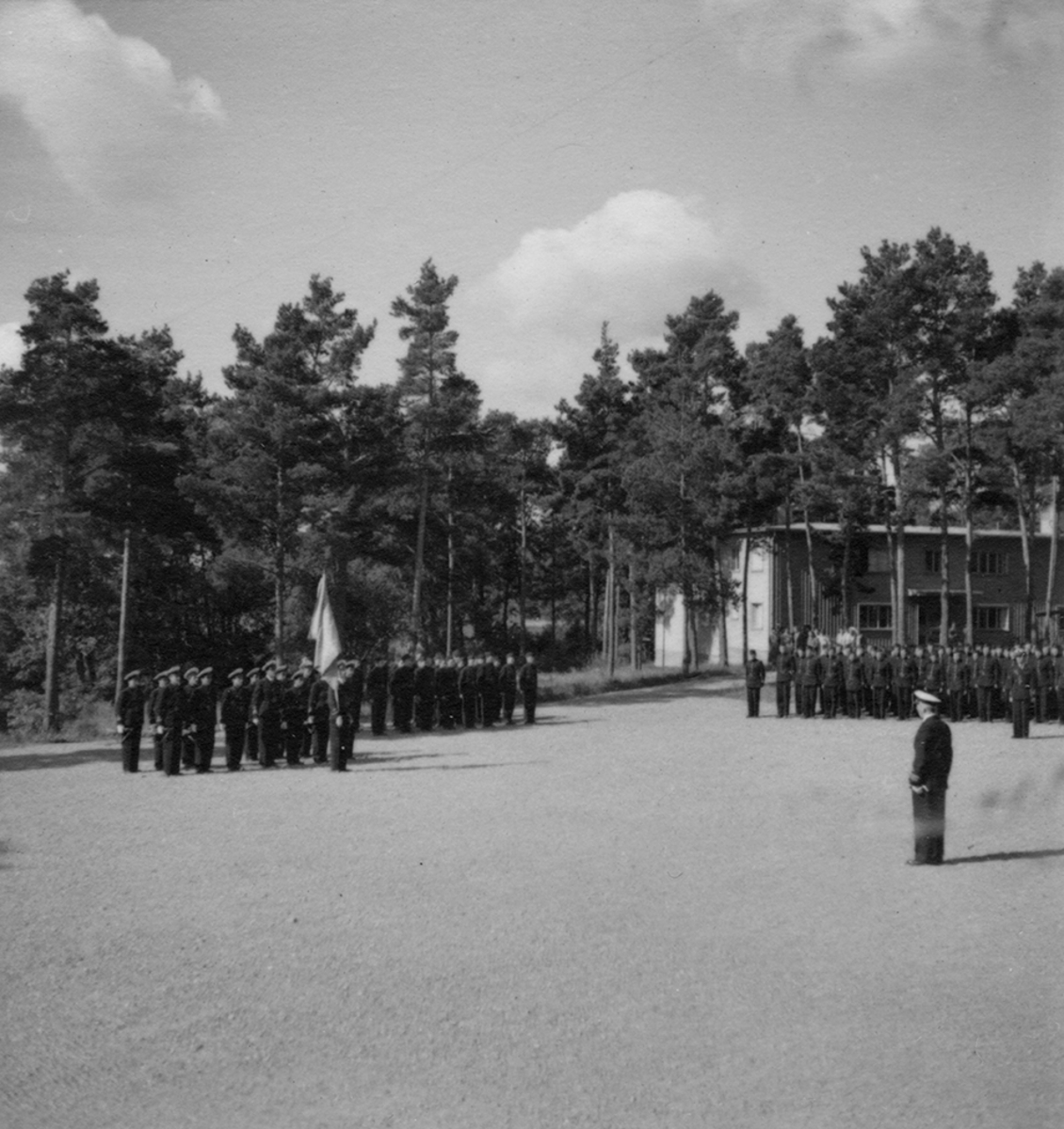 Korum vid kung Gustaf V:s födelsedag, 1943. Militärer i grupperad samling på gårdsplan på F 2 Roslagens flygflottilj.