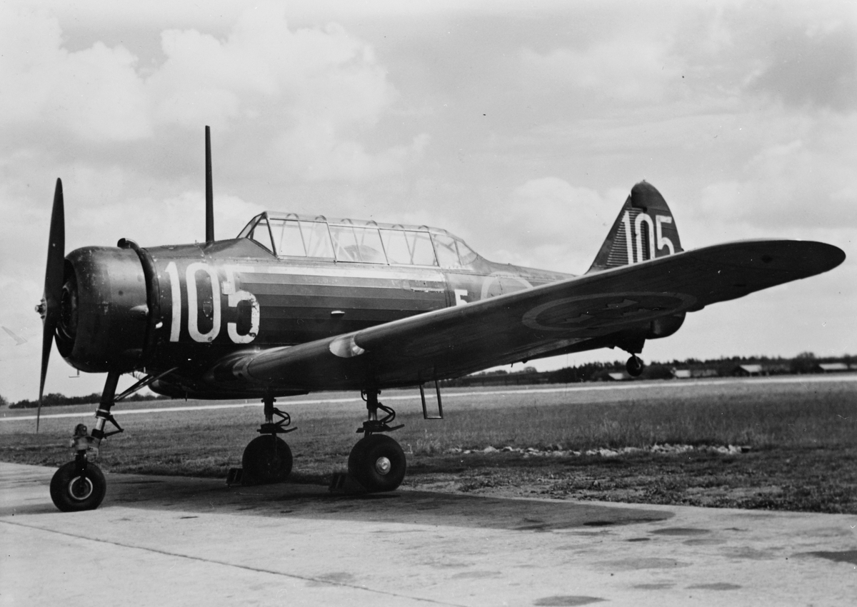 Flygplan SK 14 märkt nummer 105 med noshjul tillhörande Krigsflygskolan F 5 står på ett flygfält. Sidovy.