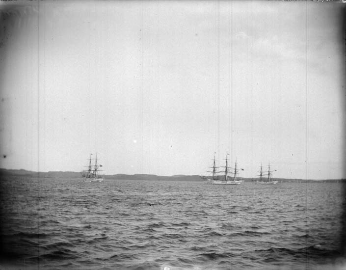 Enligt text som medföljde bilden: "Lysekil. Skeppsgossefartygen Najaden, Gladan och Falken från sjön. Liten parad. 24/6 1899".