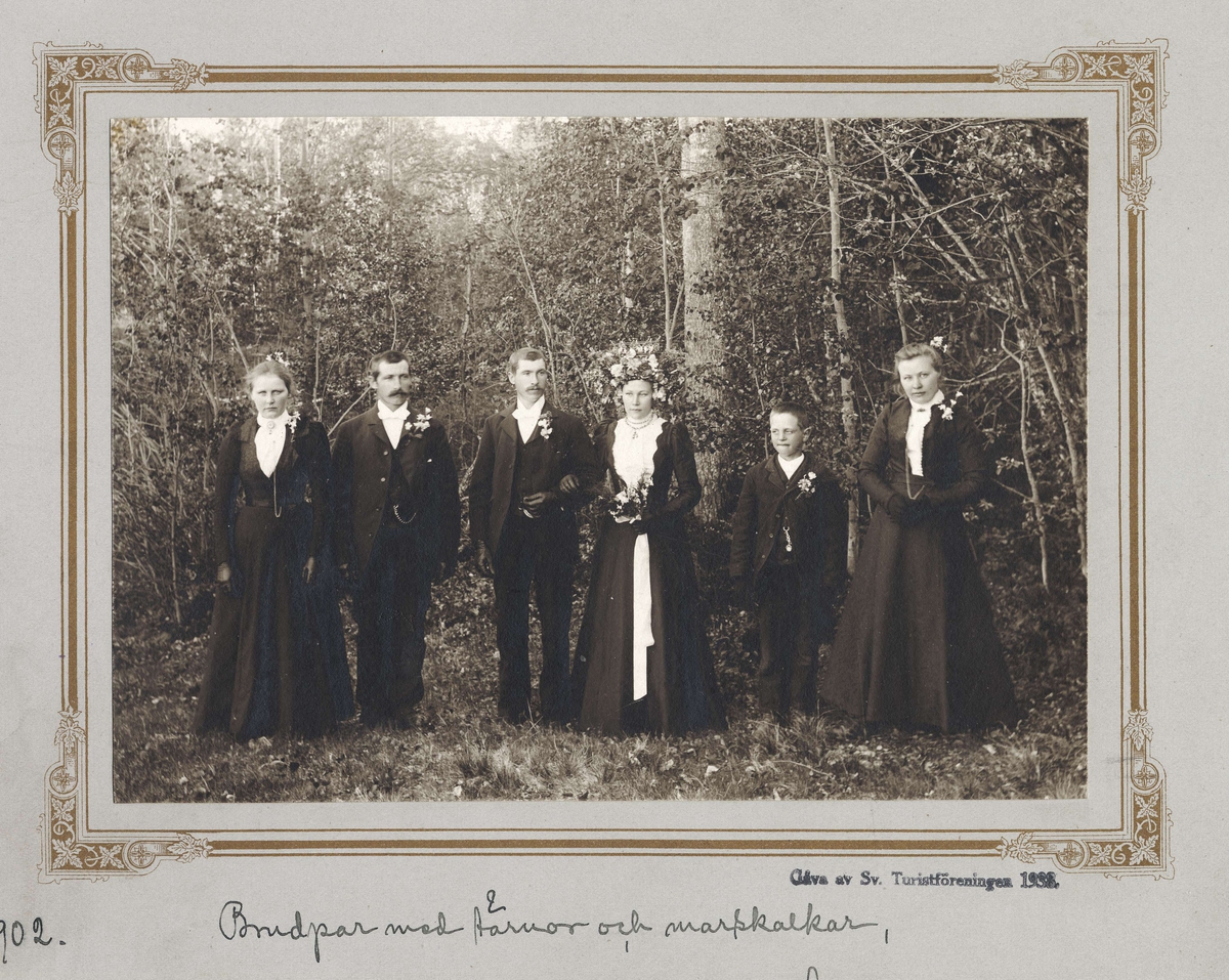 Bröllop, Stensåsen, Lillhärdals socken, Härjedalen. Brudpar med tärnor och marskalkar. Fr.v. Emma Torsa, farbror Lars, brudparet Hammarberg, Sven Ersa, Lisa. Bilden vann 5:e pris i STF:s fotografitävling 1902.