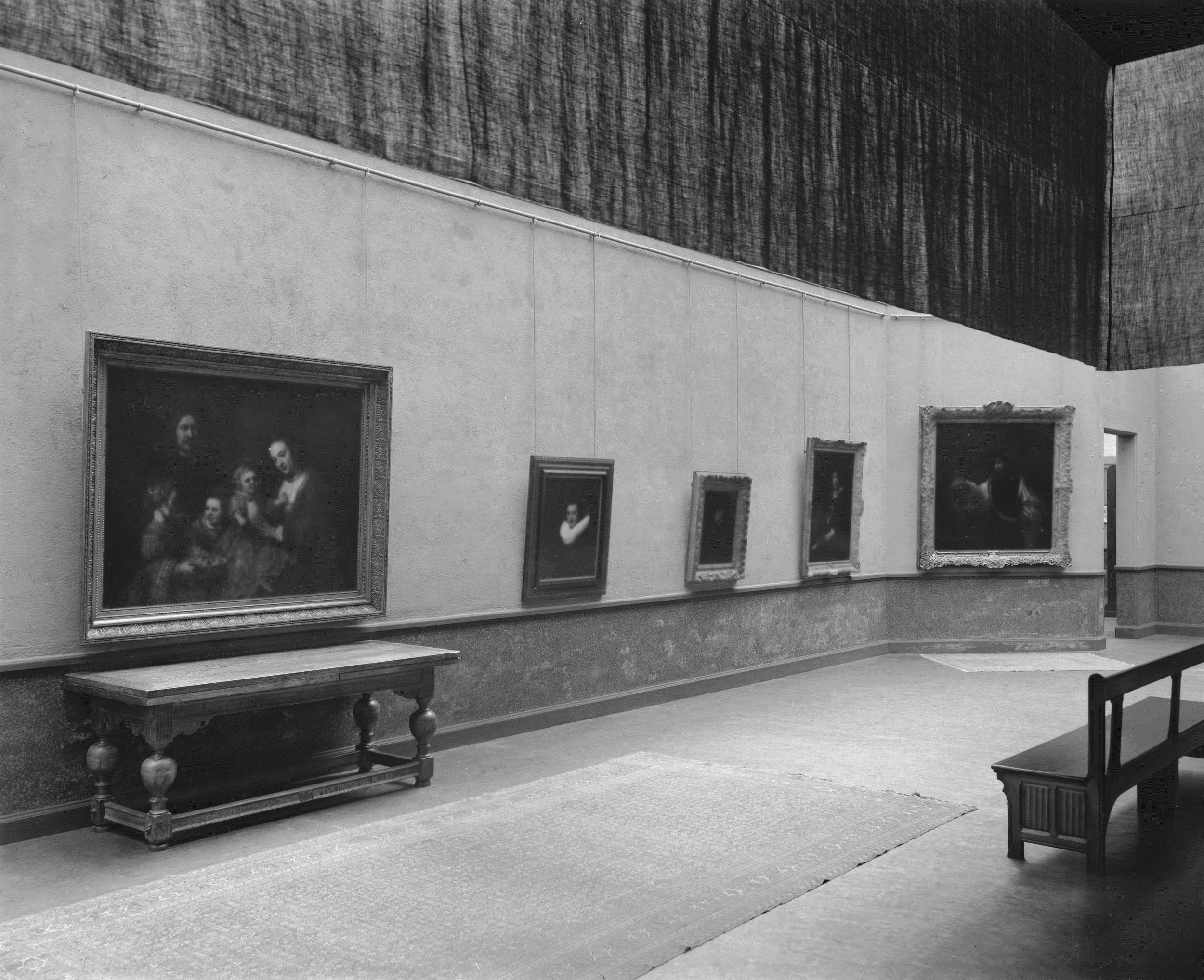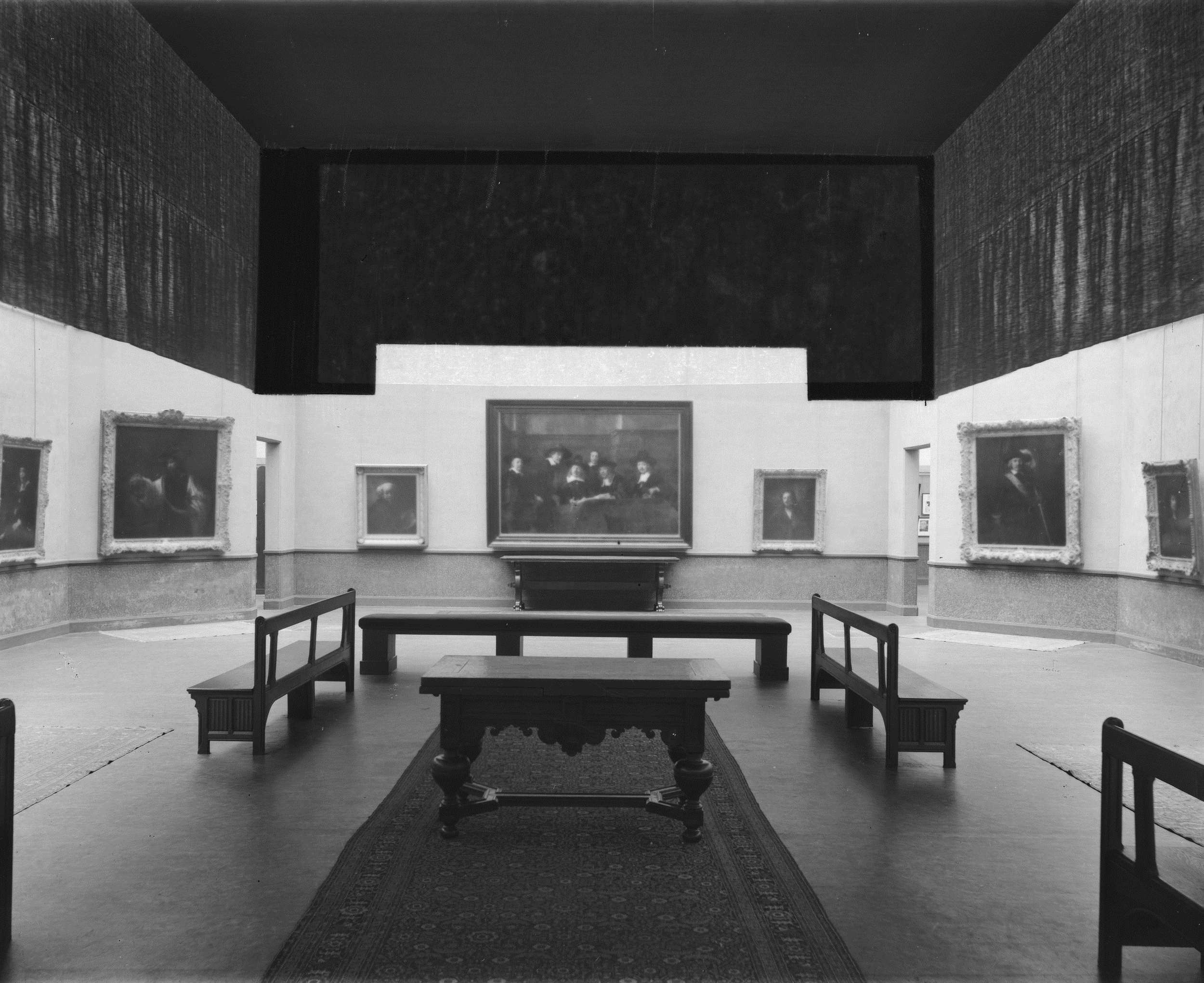 Middenzaal met schilderijen, banken, lambrisering en vooraan een 17e-eeuwse tafel