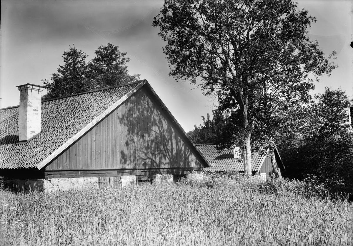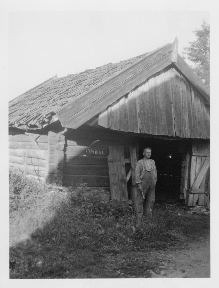 Gammal bod från Lindbacken, Ale-Skövde. Huset på bilden märkt 1734 iB AB. Framför boden står en man.