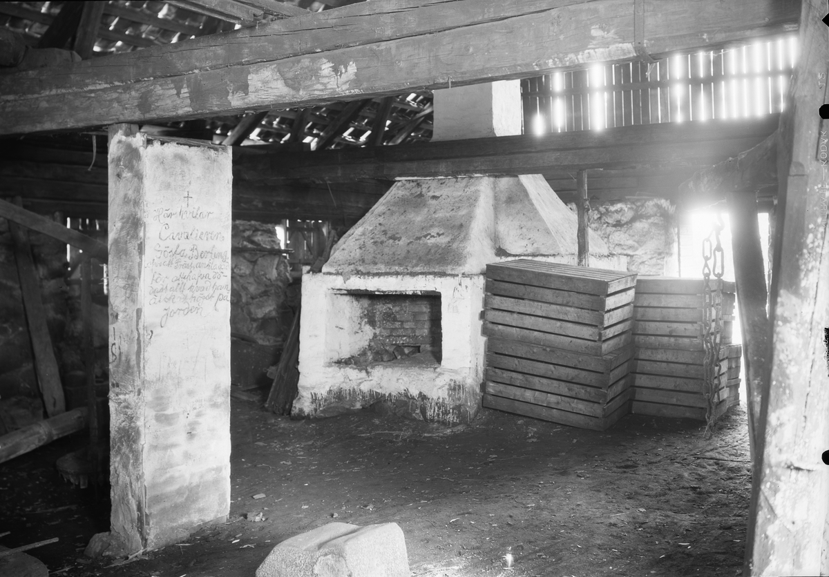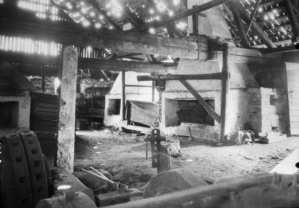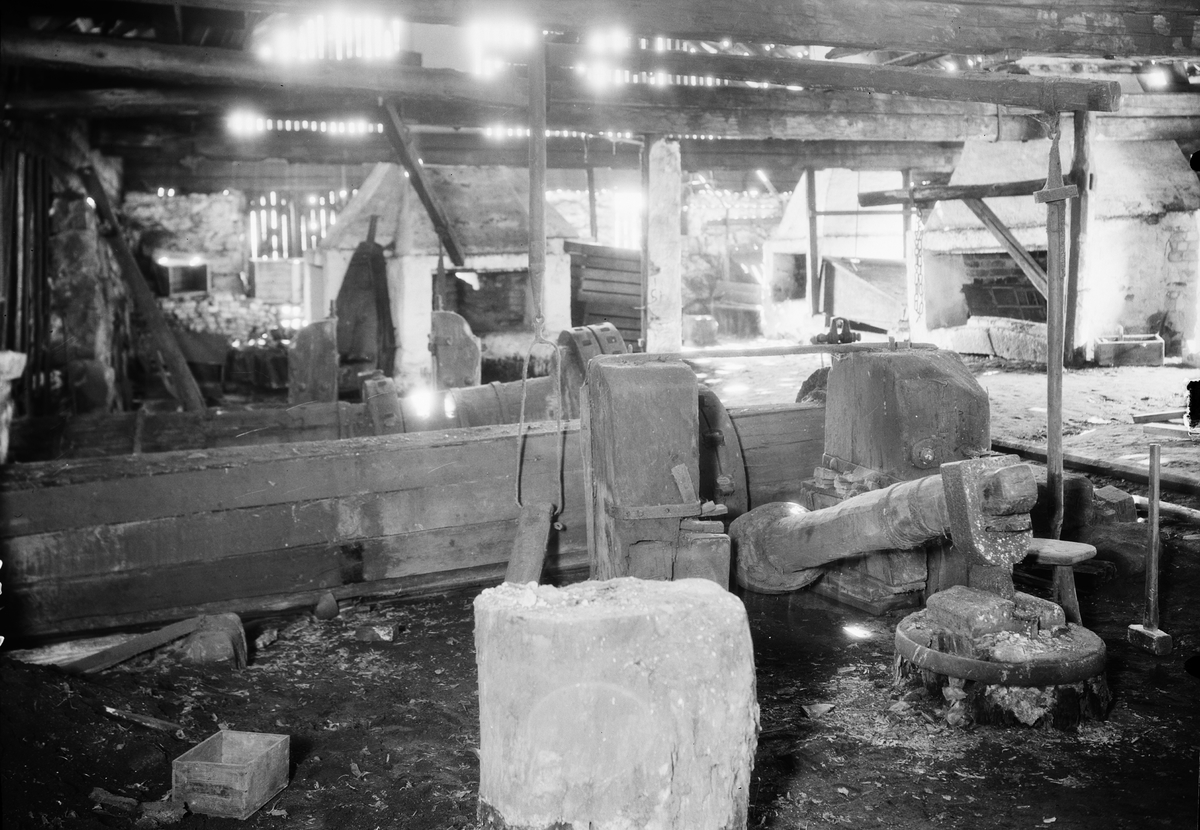 Interiör av stora smedjan. Till höger storhärden med bälg och svängkran. I bakgrunden liten härd. Till vänster synes hörnet på den ena fyrhärden.