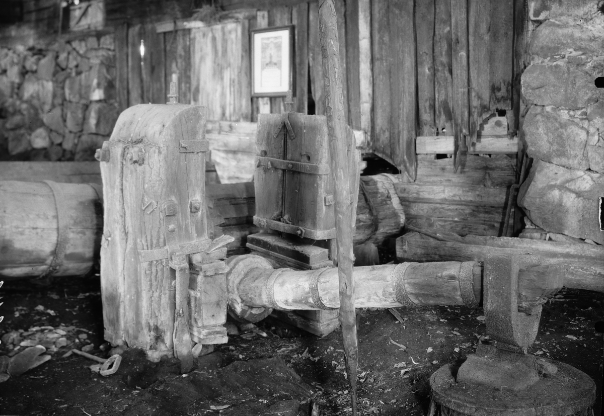 Interiör av stora smedjan. Anordningen vid vattenhjulsstocken som drev bälgen till storhärden. Bälgen synes i bakgrunden.