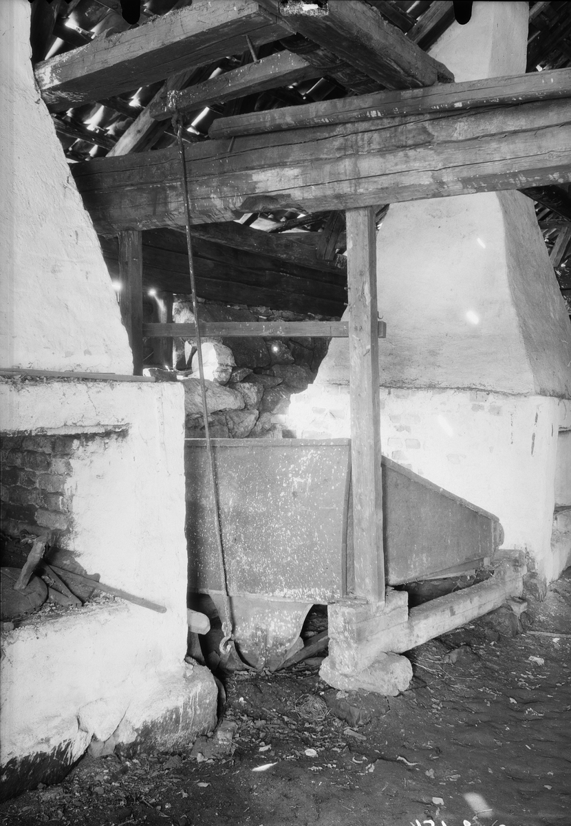 Interiör av stora smedjan. Bälgen till den sk storhärden. Denna bälg drevs av den ena vattenhjulsstocken medelst en inrättning som gick tvärs över smedjan. Fotopunkt 10.