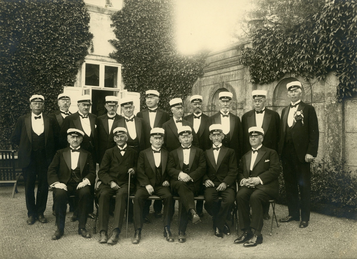 Grupporträtt av 1887 års studenter samlade till 45-års jubileum på Övedskloster, den 11 juni 1932.