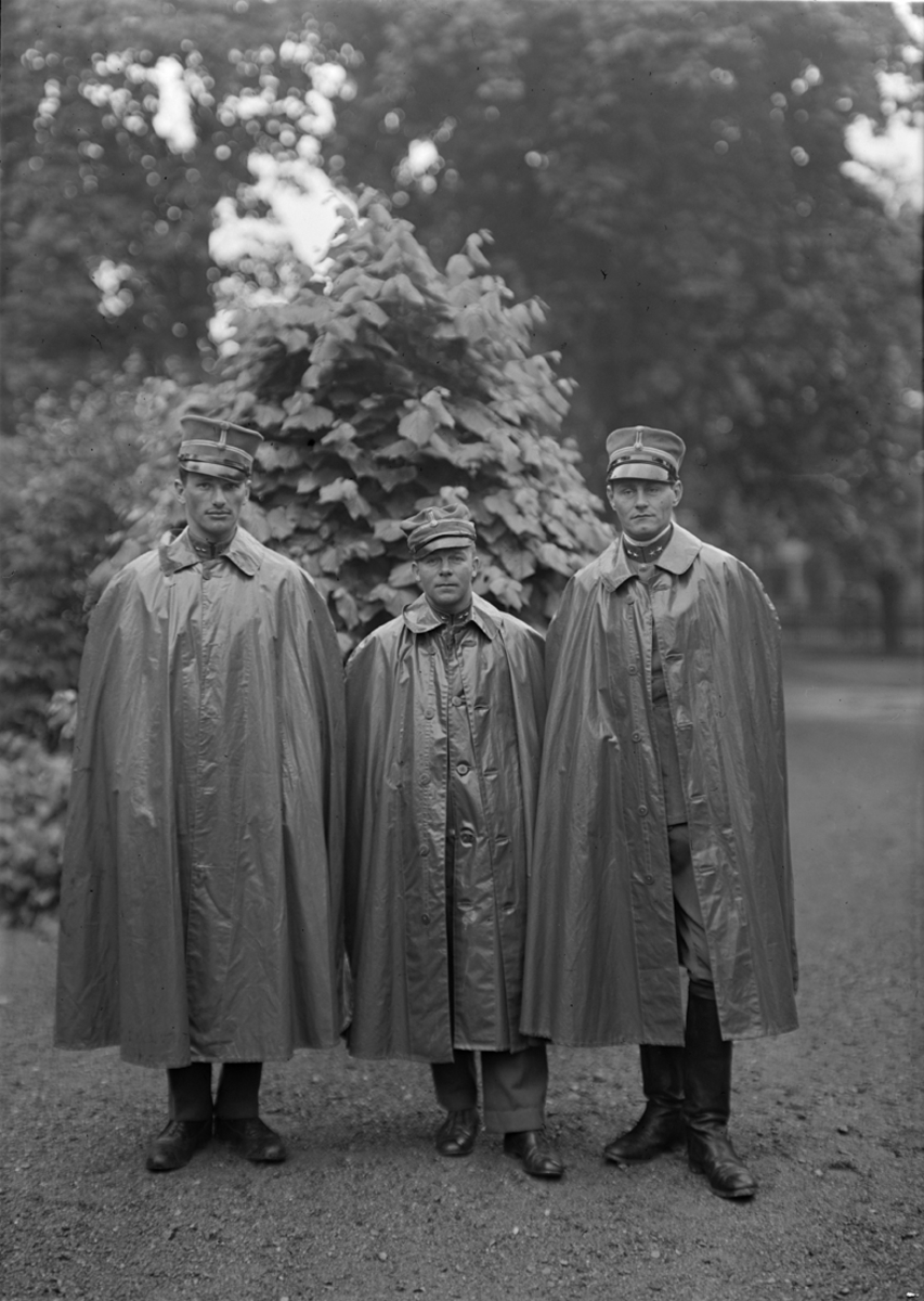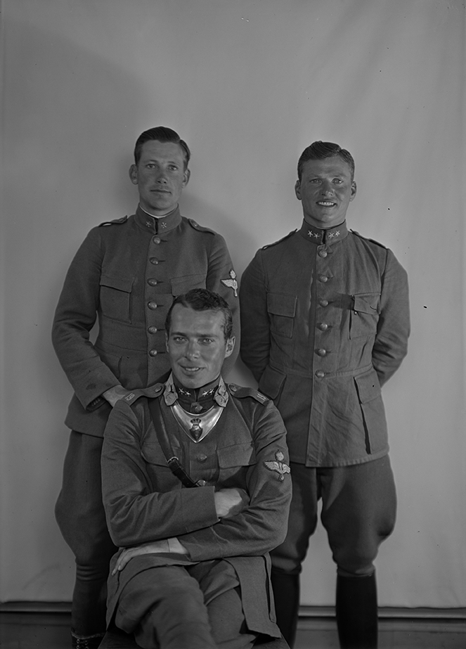 Grupporträtt av löjtnanterna Bengt Weman, Lars Horn och Per Sterner, militära flygförare och flygspanare.