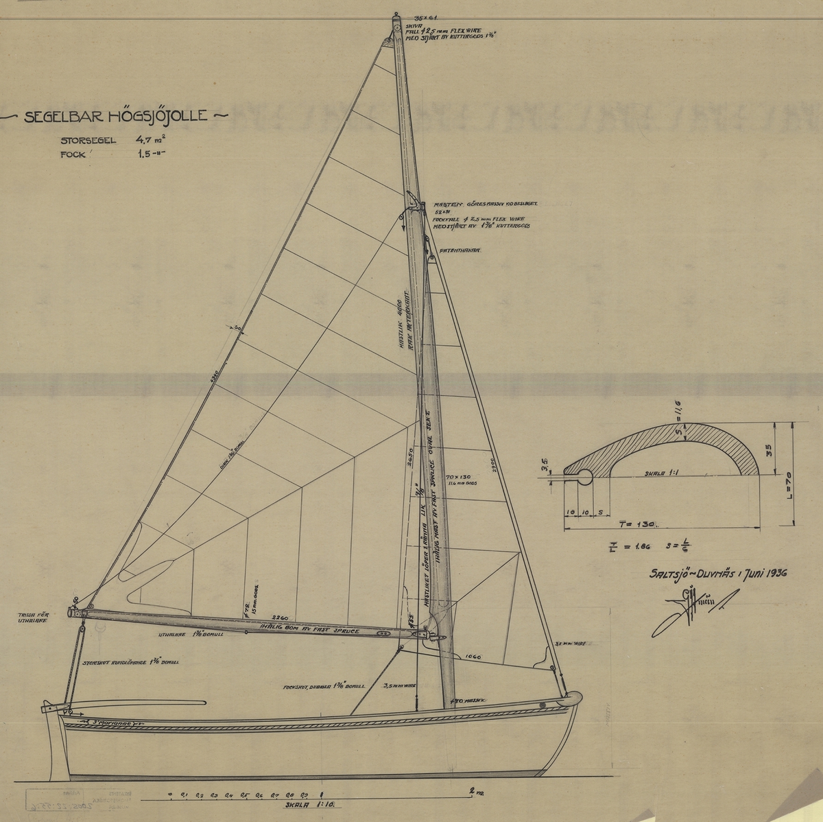 Fidelity BF1479 (1904). Scale 1:48. A plan showing the sail arrangement of the Fidelity BF1479 (1904), a Scottish Zulu. The plan was draughted by Philip Jesse Oke at Plymouth in June 1936.
