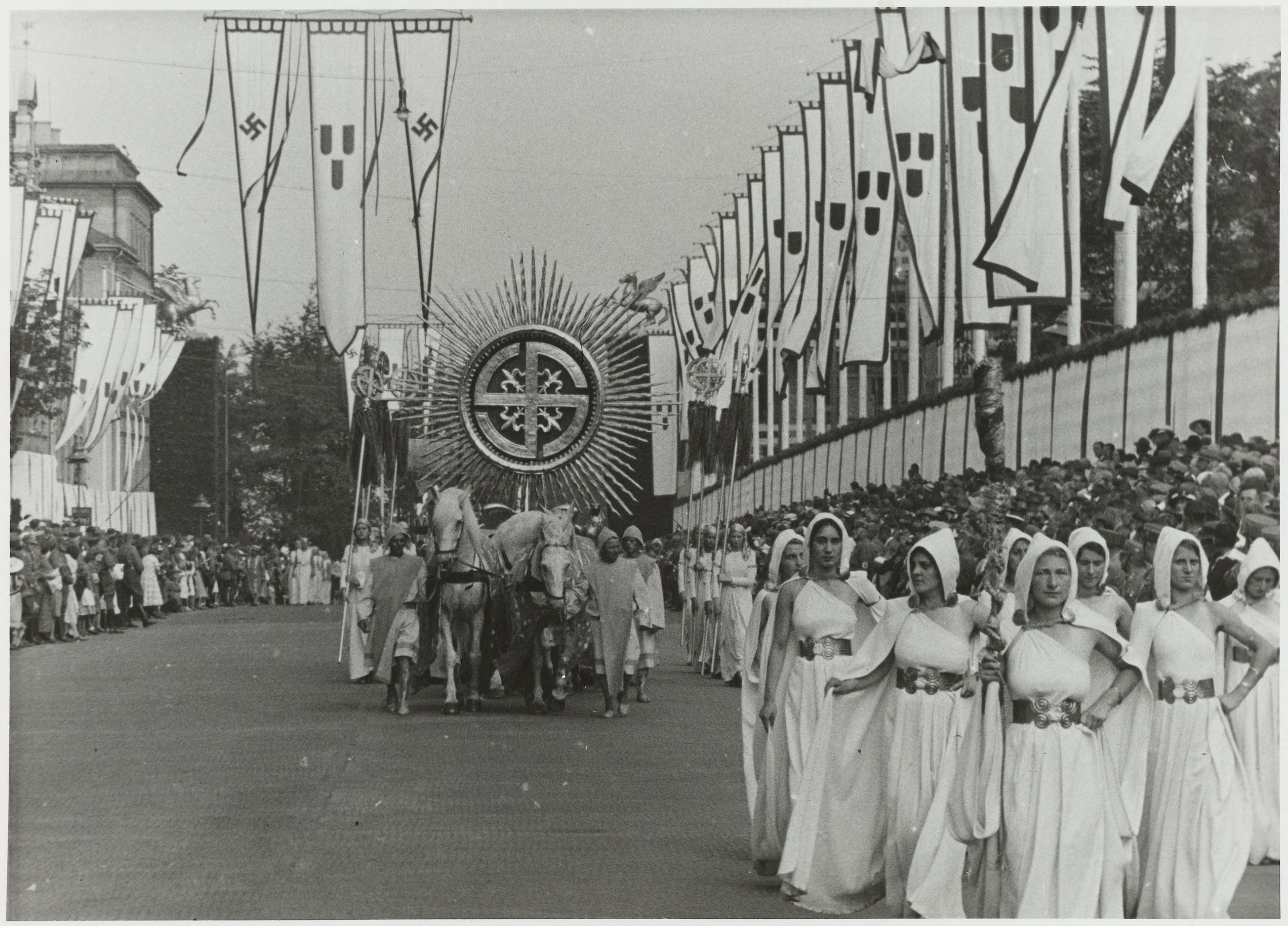 Feestelijke optocht van de 'Abteilung "Die germanische Zeit" des Festzuges 2000 Jahre deutsche Kultur' in München, 1937