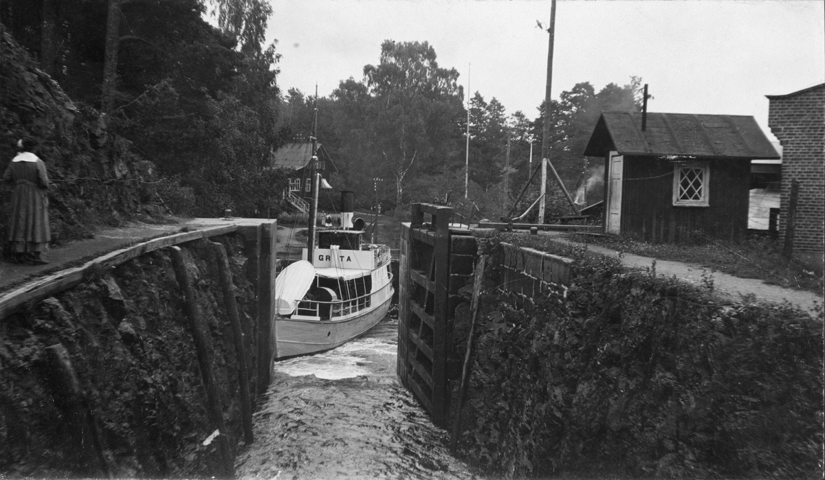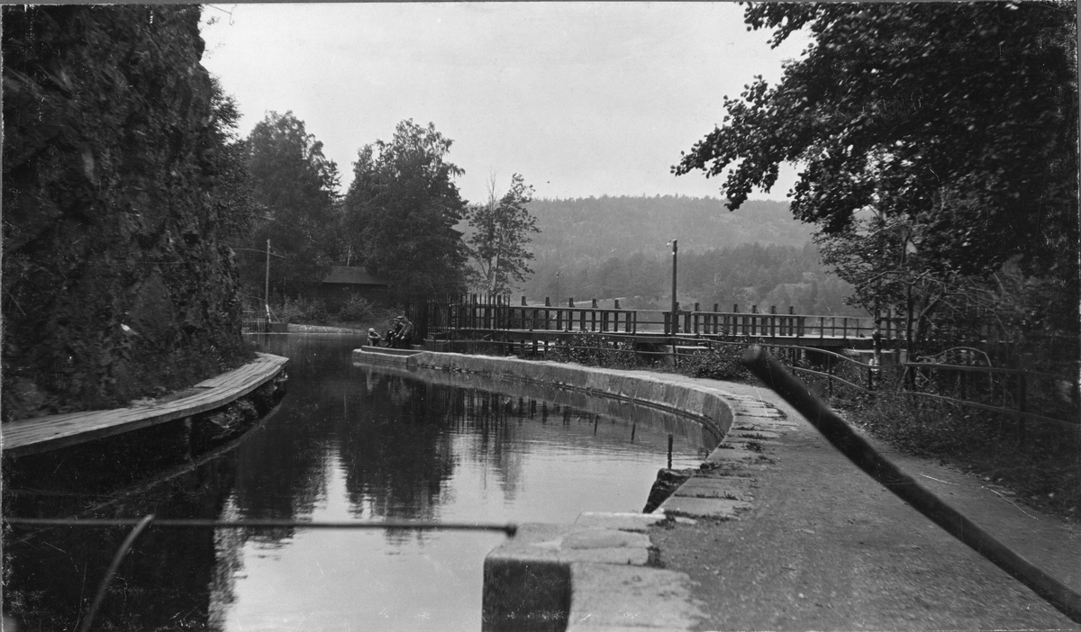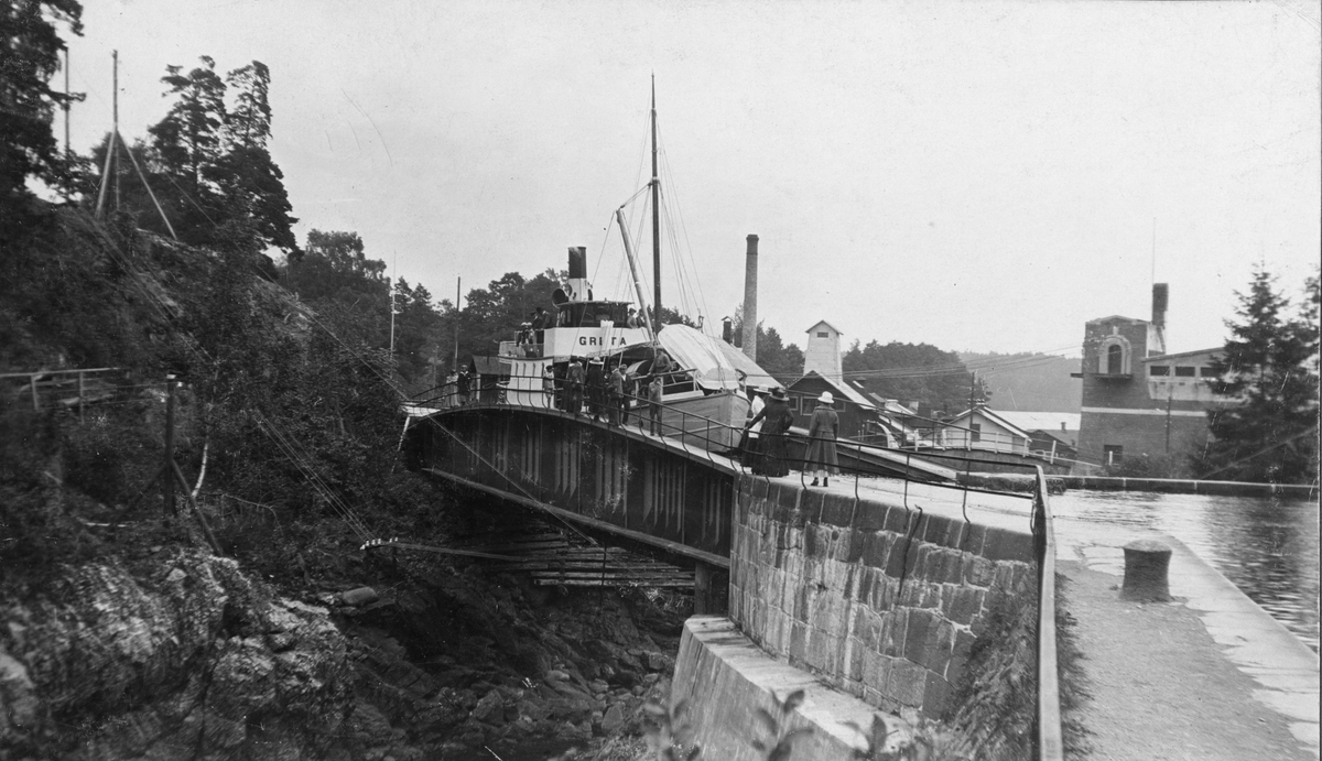 Dalslands Kanal. Akvedukten i Håverud med ångbåten Greta. Forsen under var vid fotograferingstillfället torrlagd.