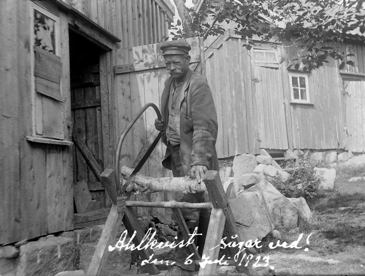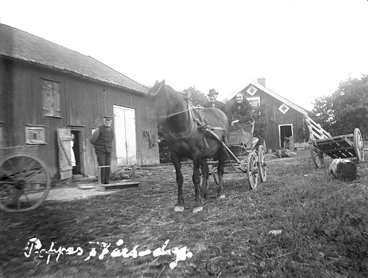 Enligt noteringar: "Pappas 77årsdag. I lagårdsdörren Lisa, Johannes A. I kärran en broder och hans fru".