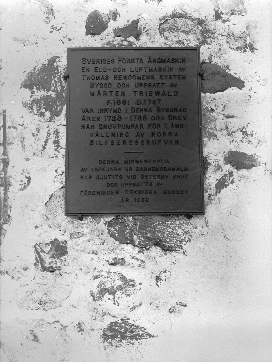 Föreningen Tekniska museet uppsatta minnestavlan på det hus i vilket Mårten Triewalds eld- och luftmaskin var inrymd, Dannemora.