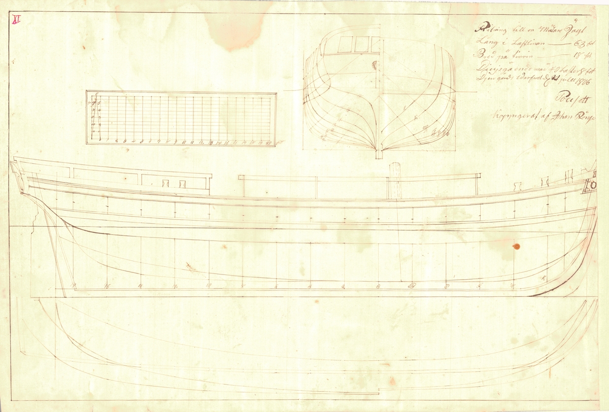 Carnatic (1783). Scale: 1:96. Plan showing the inboard profile, roundhouse, spar deck, upper deck, lower deck, orlop deck, and fore platform for Carnatic (1783), a 74-gun Third Rate, two-decker, as fitted for a Receiving Ship at Plymouth Dockyard between