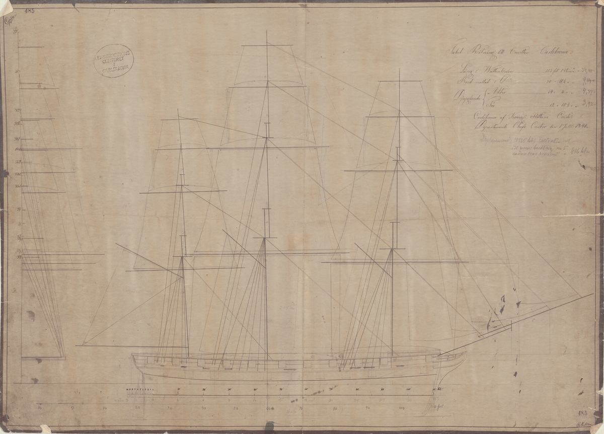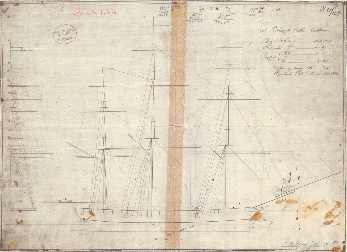 'Coronation' (1831). Scale: 1:48. A plan showing the body plan with half stern board outline, sheer lines with some inboard detail, and longitudinal half-breadth for 'Coronation' (1831), a fifty-seven foot tank vessel, as taken off in