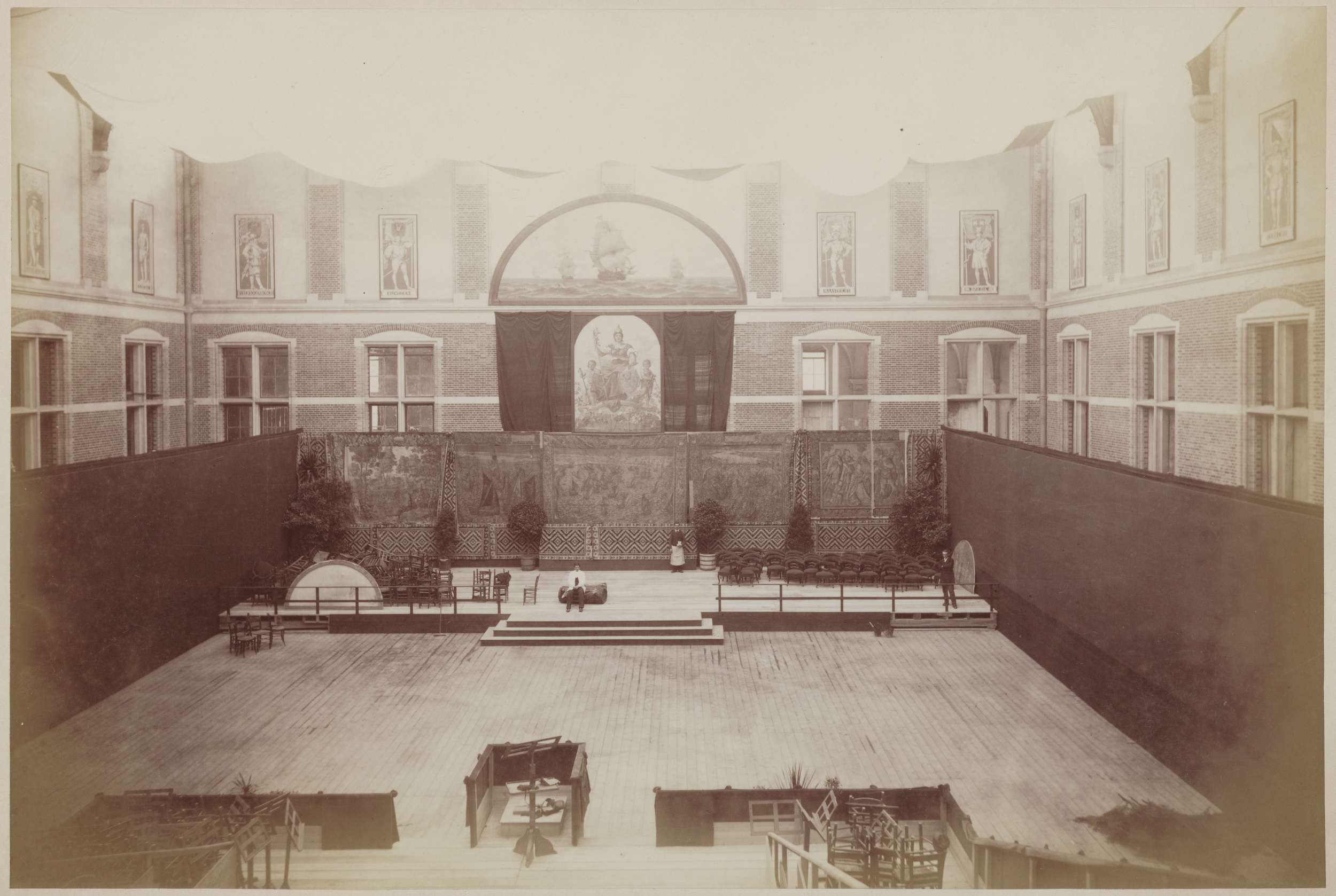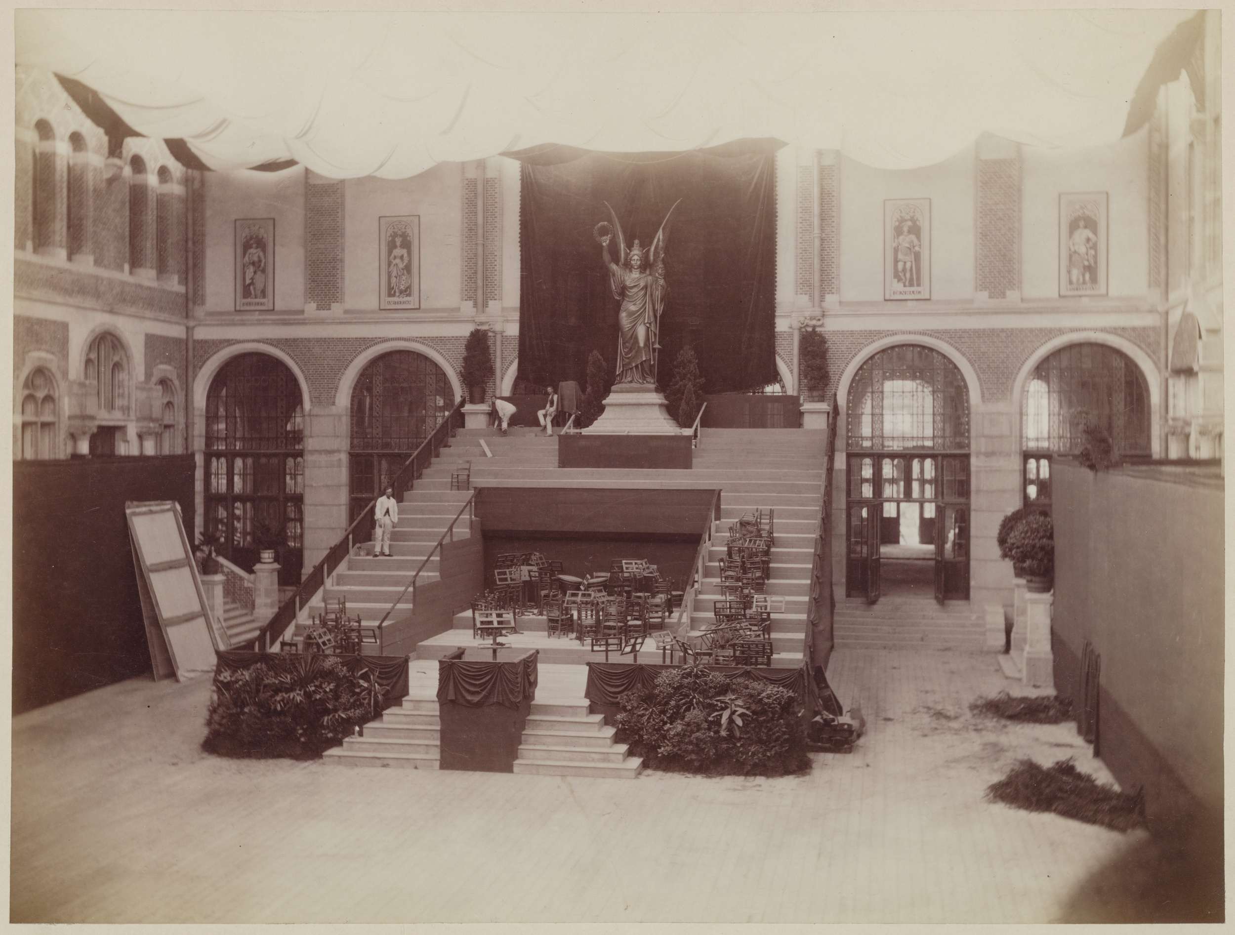 Inrichting oostelijke binnenplaats voor openingsceremonie van het Rijksmuseum