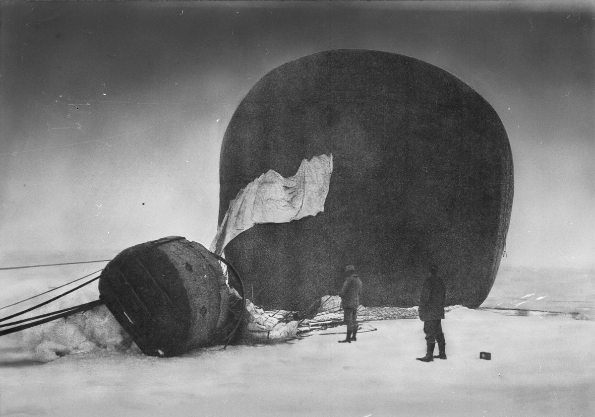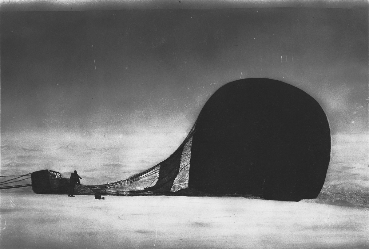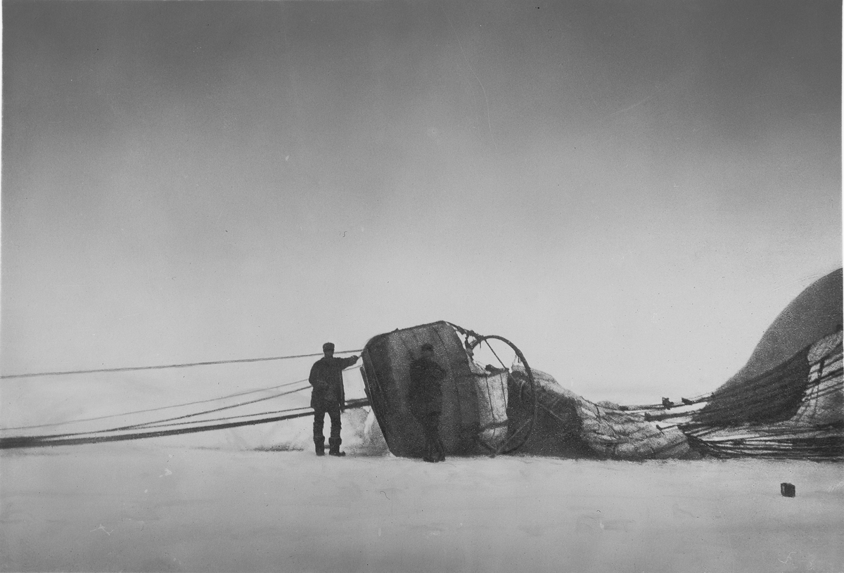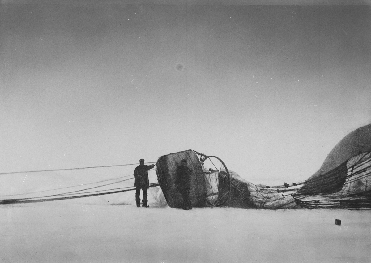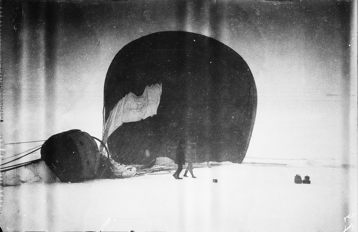 "Örnen" omedelbart efter landningen på isflaket den 14 juli 1897. Framtagning av bilderna gjordes av docent John Hertzberg år 1930 på Fotografi, Tekniska Högskolan.