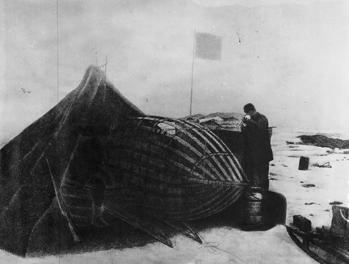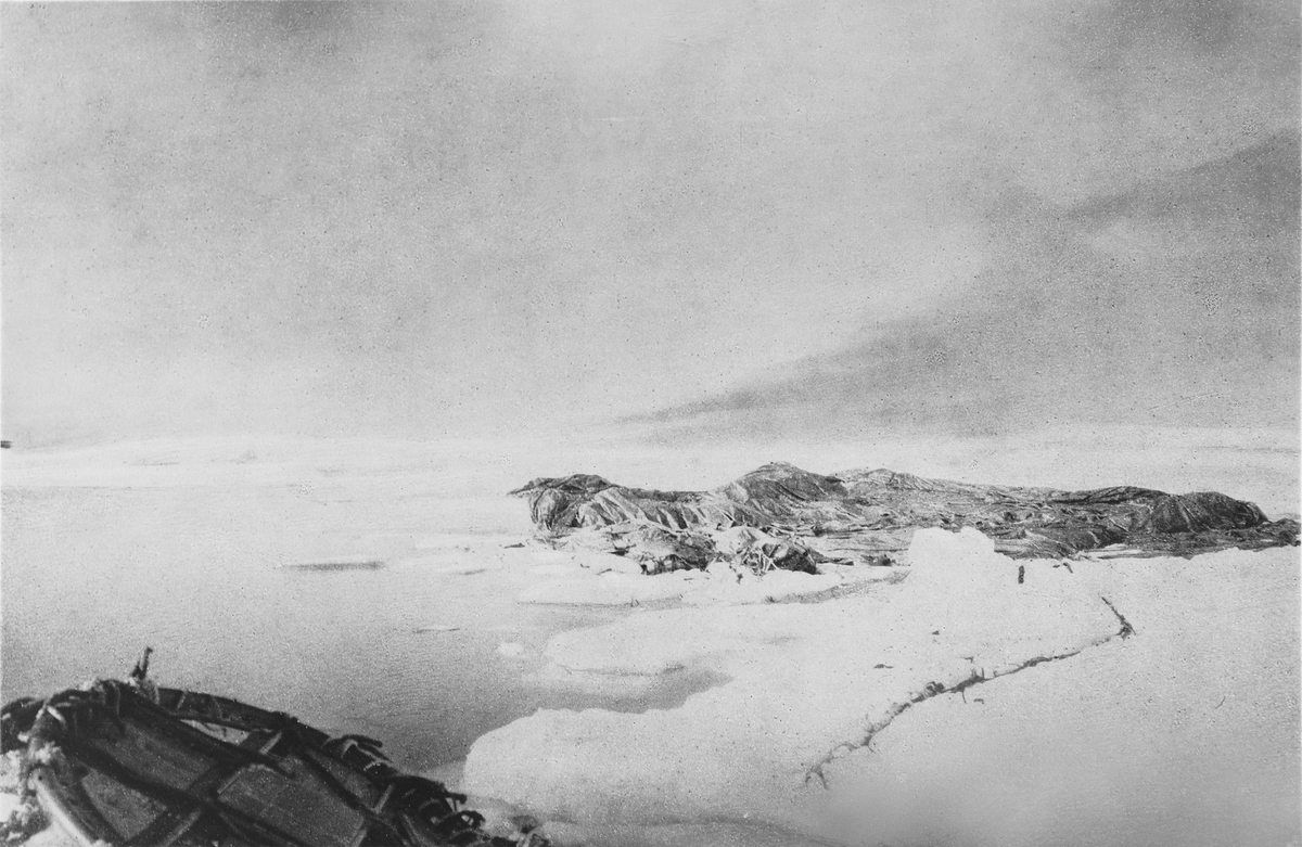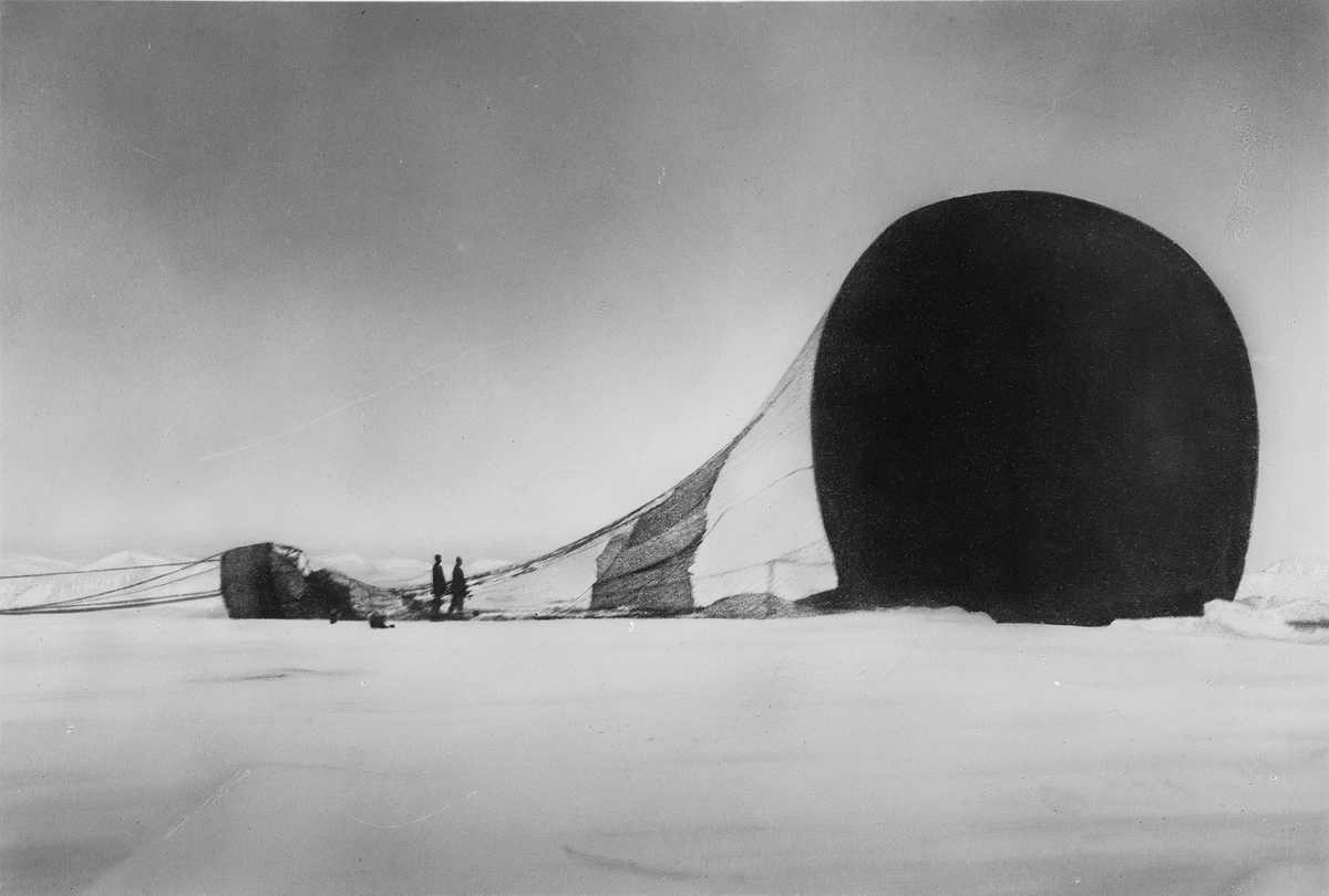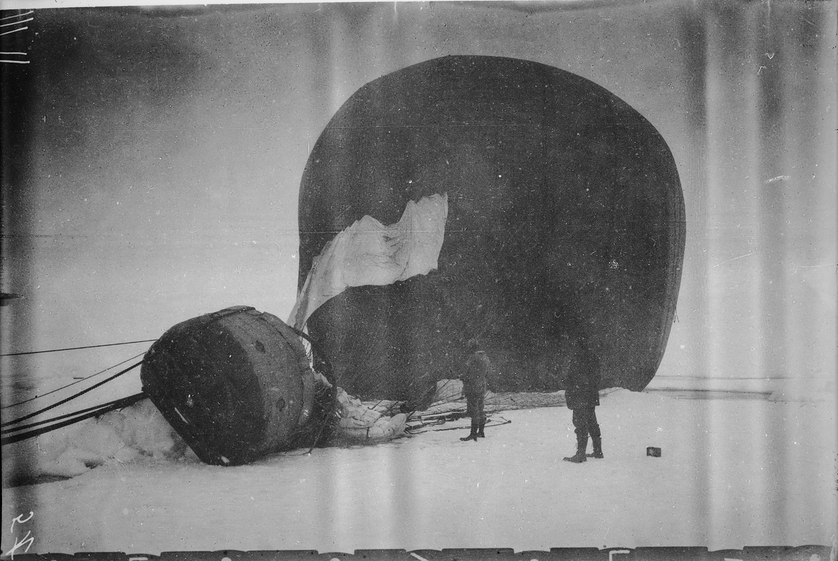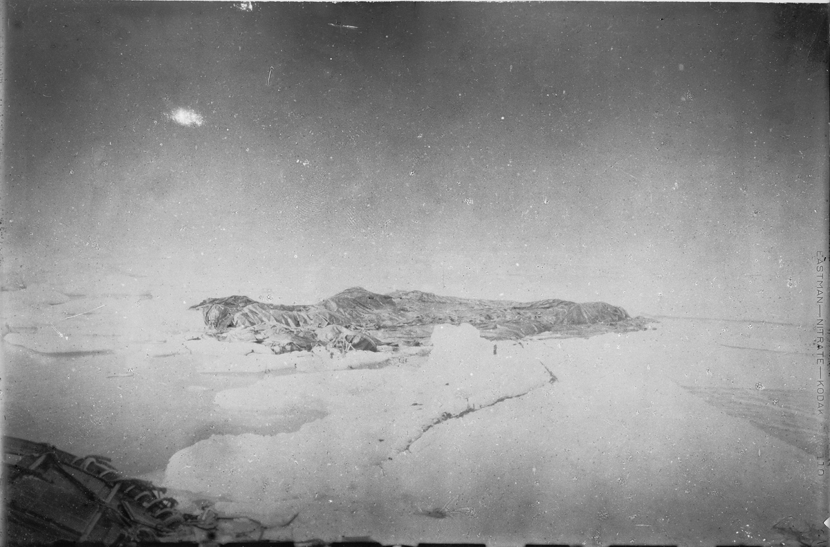 "Örnen" omedelbart efter landningen på isflaket den 14 juli 1897. Framtagning av bilderna gjordes av docent John Hertzberg år 1930 på Fotografi, Tekniska Högskolan.