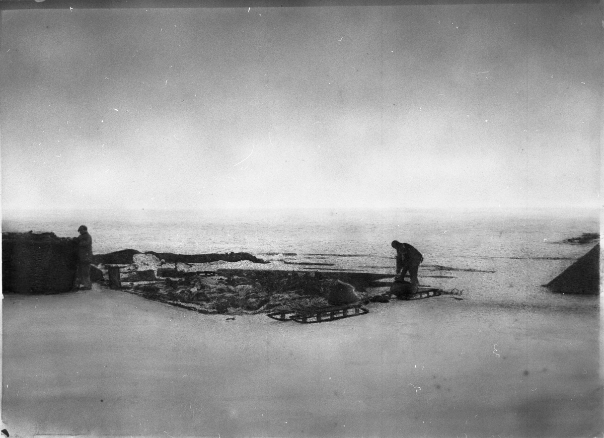 1 juli 1897. Lägret vid "Örnens" landningsplats. Kälkarna pekas för avfärd. Framtagning av bilderna gjordes av docent John Hertzberg år 1930 på Fotografi, Tekniska Högskolan.