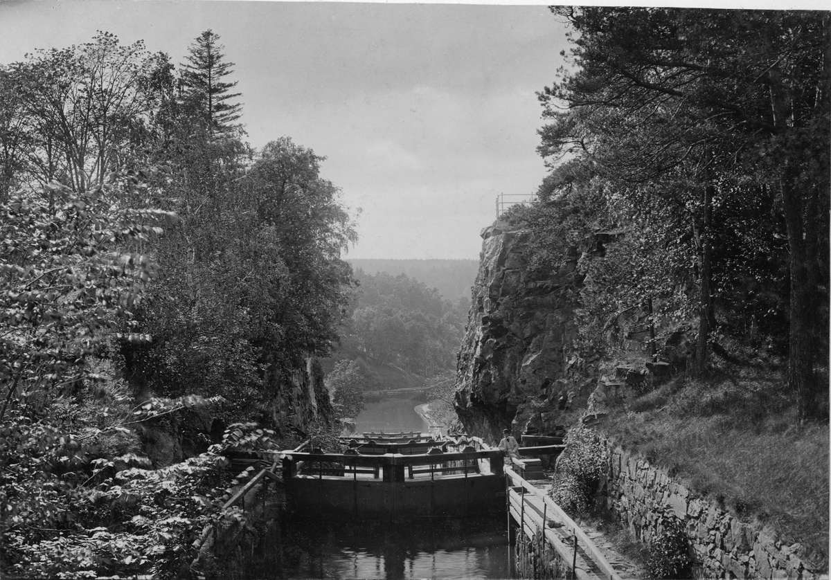 Gamla slussarna i Trollhätte kanal. Fotografiet inlämnat till Svenska Turistföreningens pristävlan 1898.