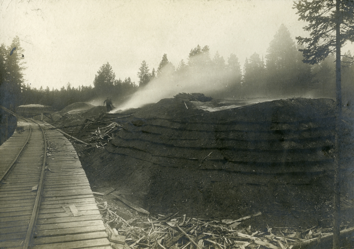 Kolning av sågspån, ribb och dyl. vid Norbottens Malmförädlingsfabrik på Svartön i Luleå iaugusti 1901.