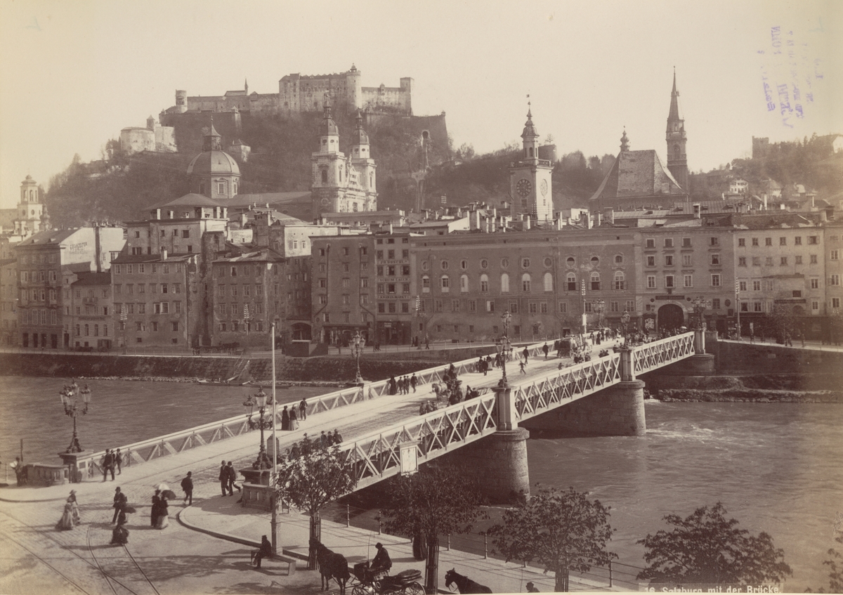 Ur album: Utländska Resan 1900 I. Vy över Salzburg med Stadtbrüggen och fästningen Festung Hohensalzburg.