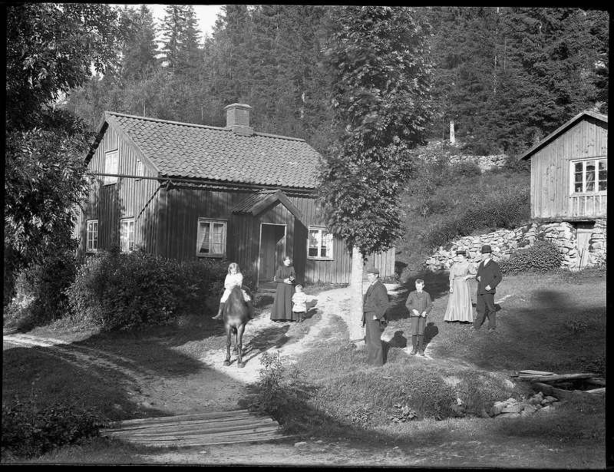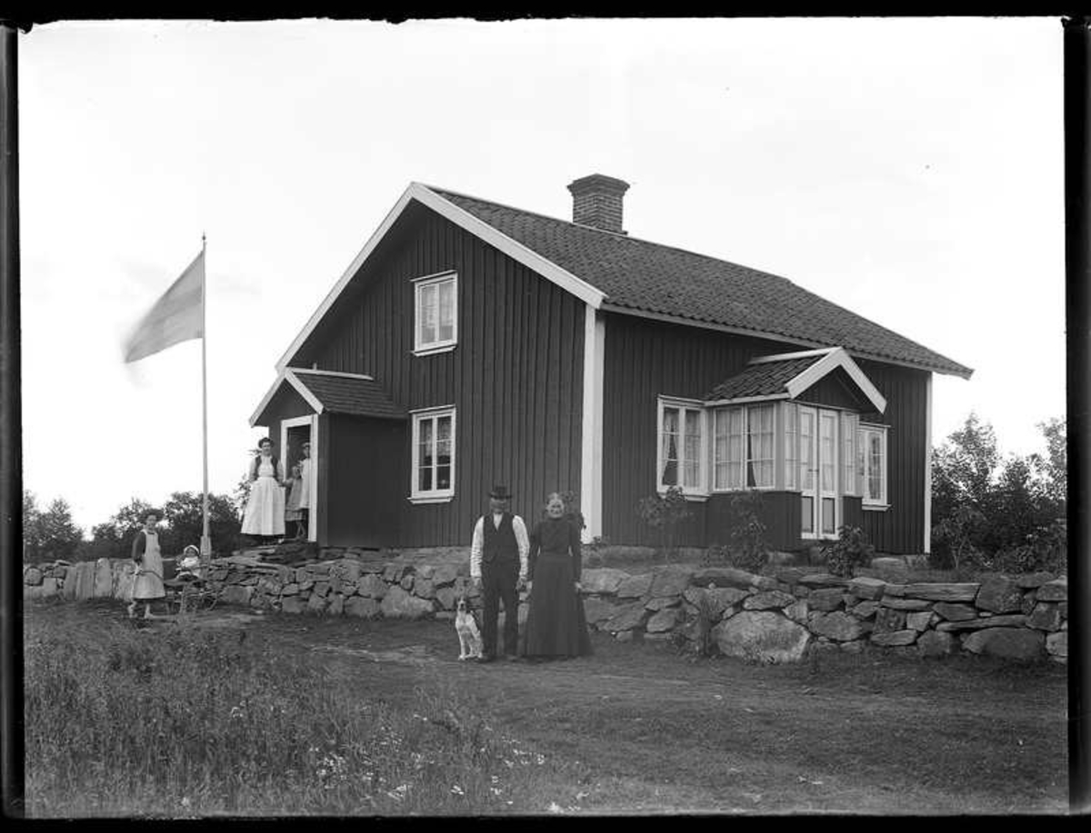 Leander Anderssons rödmålade bostadshus med vita knutar och enkupigt tegel på taket. Karlinders barn med barnjungfru och barnvagn. Gerda Johansson H