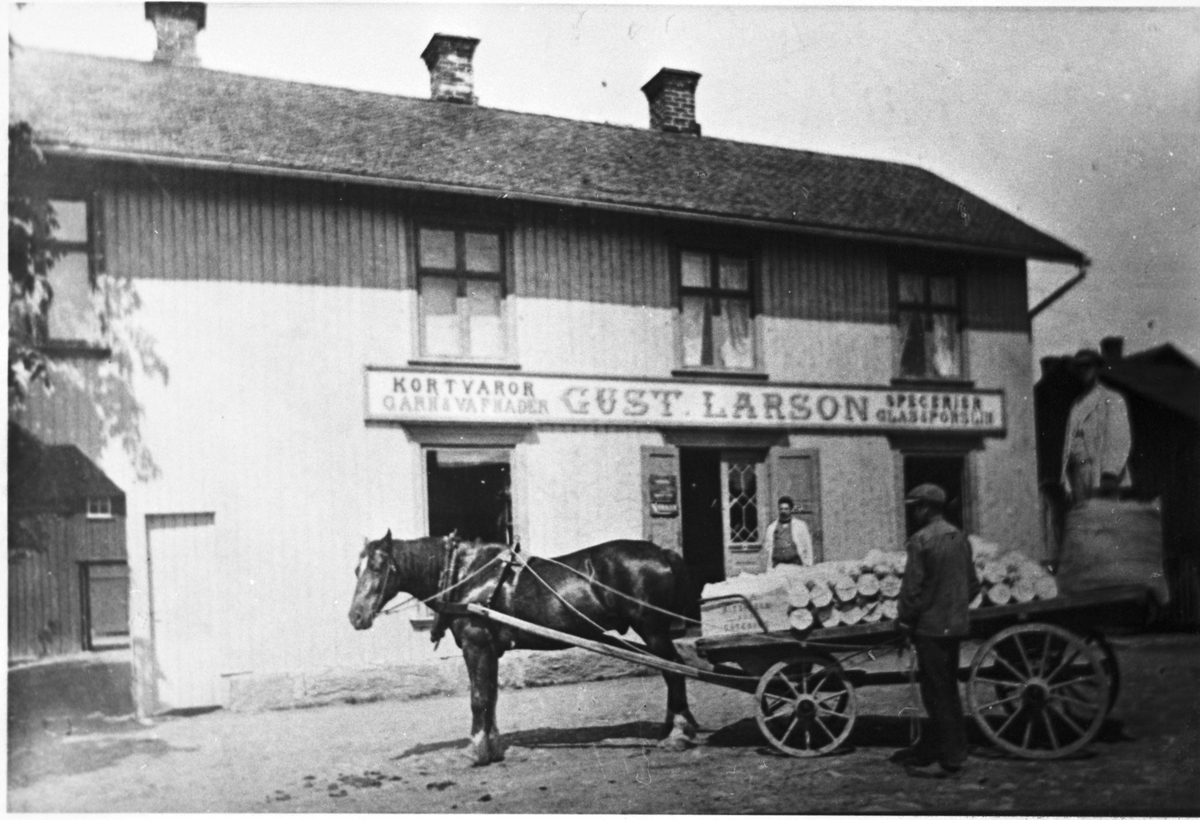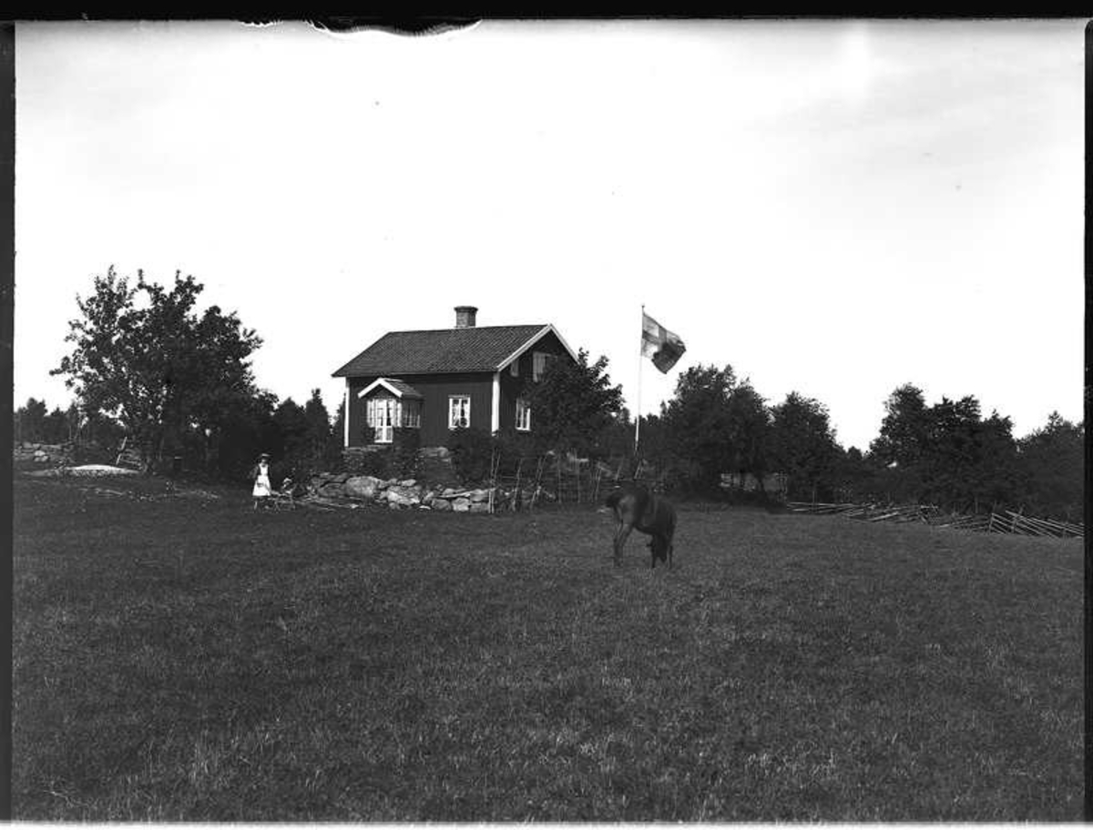 Olof Jonssons text: Leander Anderssons hus med flagga och häst. Karlinders barn med barnjungfru och barnvagn syns framför huset.