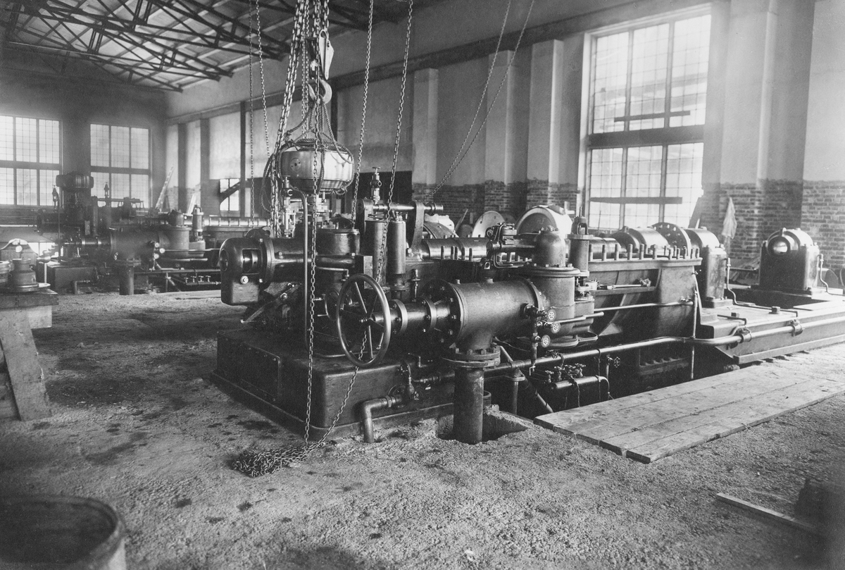 Elektriska maskiner. The foremost part of the large turbines with pipings and governos ready.