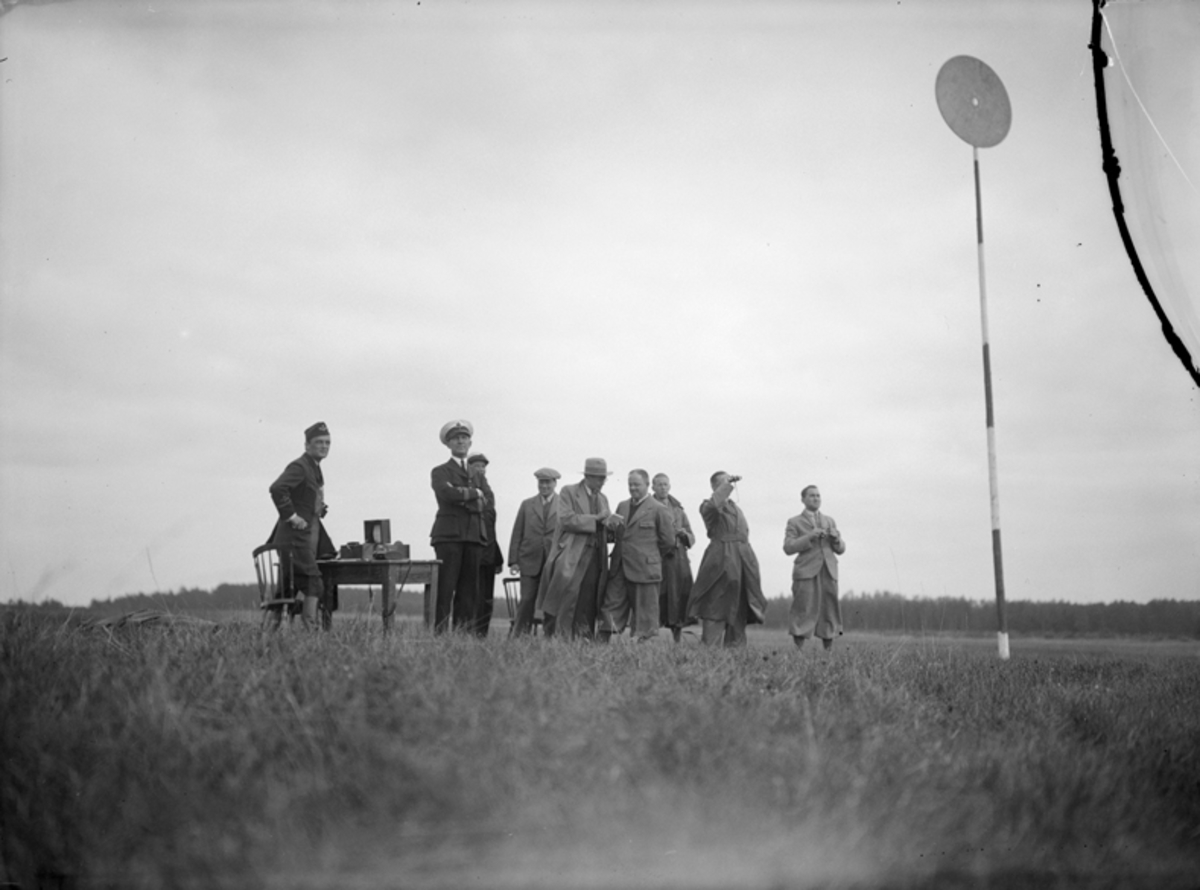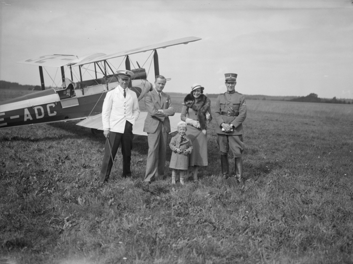 Porträtt, sällskap framför civilregistrerat flygplan. Två militärofficerare och tre civilklädda personer, en man, en kvinna och en flicka på Malmen.