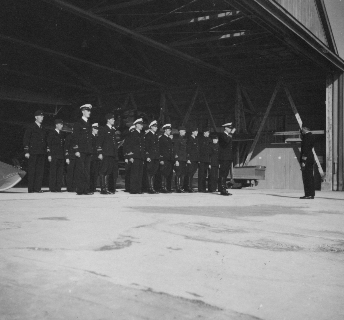 Chefen för F 2 Roslagens flygflottilj, Herman Sundin, inspekterar marinspaningskursen på Fårösund, 1938. Hälsning av manskap vid hangar.