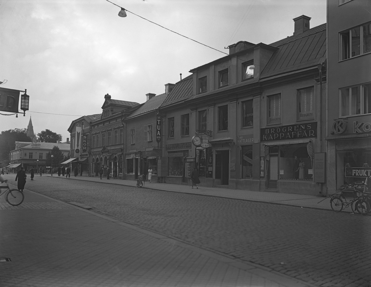 "Fredshuset", tvåvånings bostadshus med frontespis och inredd vind, affärslokaler i gatuplanet.