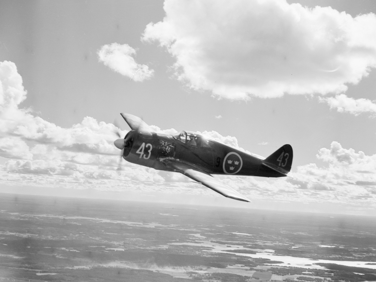 Flygplan J 22 märkt nummer 43 från F 9 Säve i luften. Sett snett nedifrån.