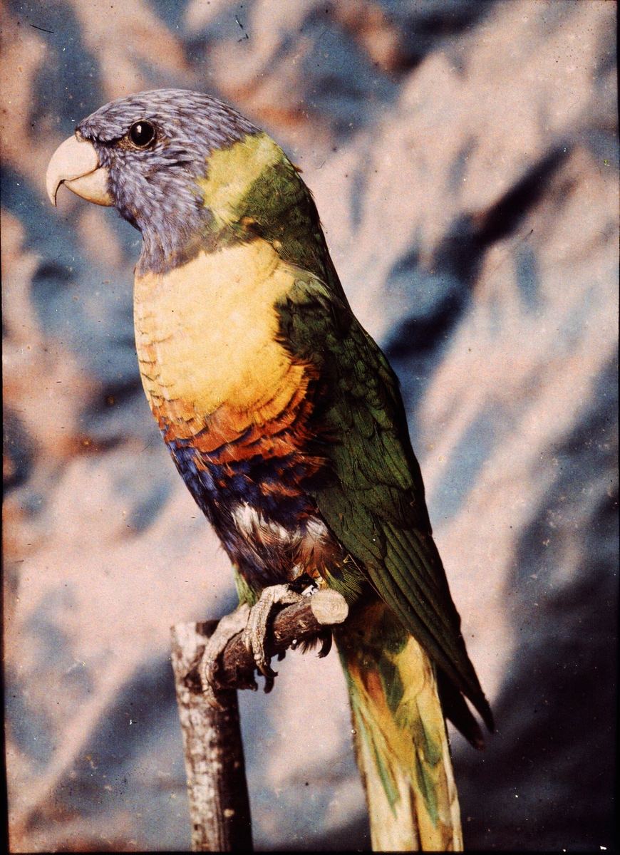 Lumières-autokrom. Papegoja Riksmuseet Prof. Sjöstedt. Fotograferad i sept. 1912 med f/11, 10 sek. exponering.