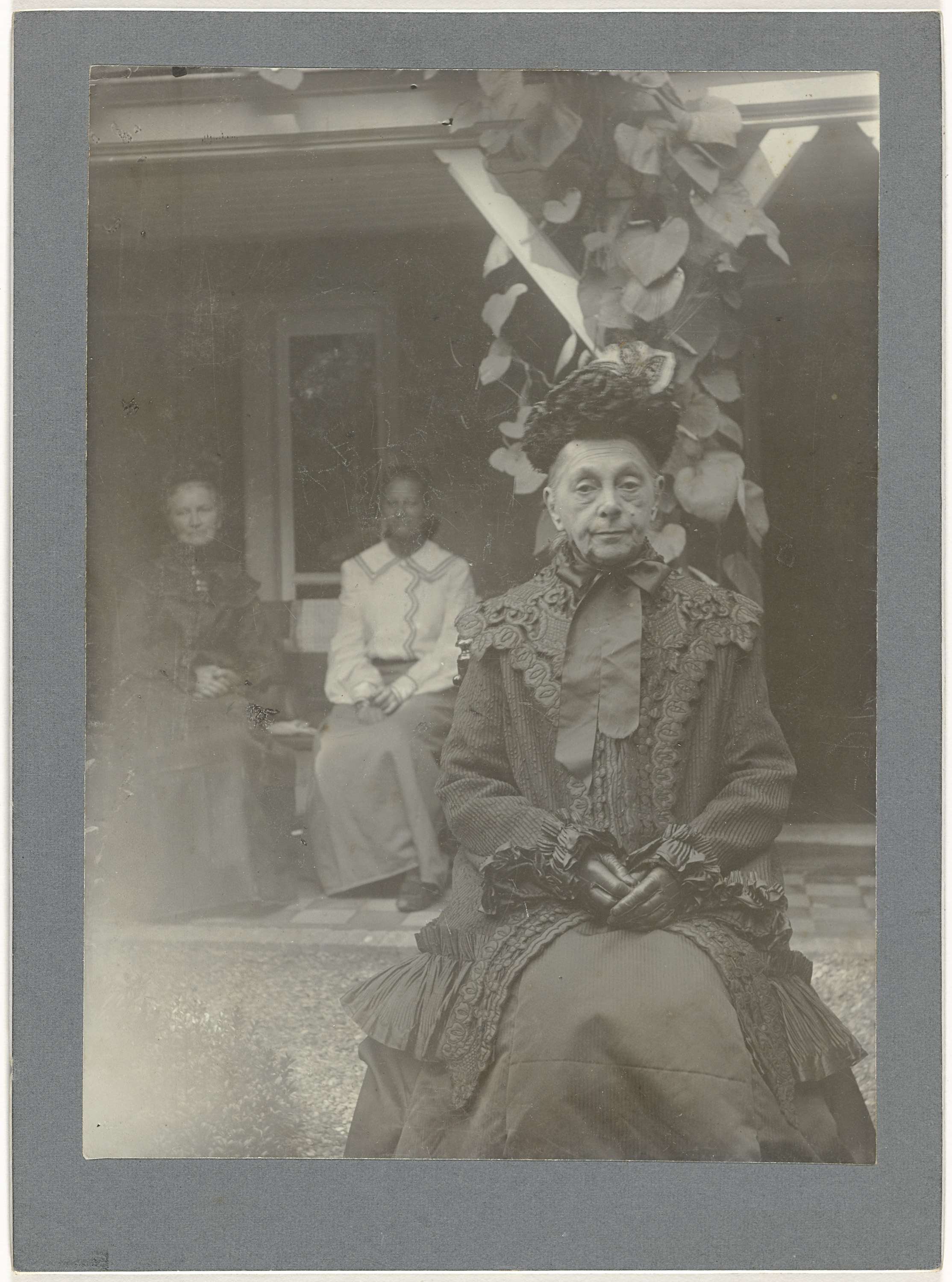 Portret van een oude vrouw in rouwkleding, met twee andere vrouwen op de achtergrond, Den Haag