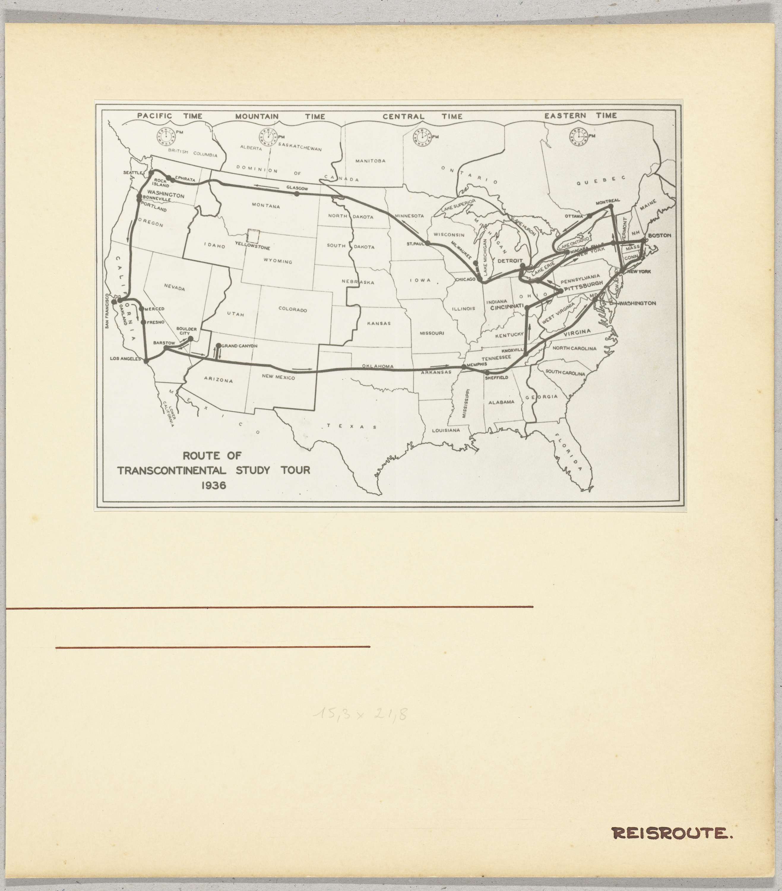 Fotoreproductie van een kaart van de Verenigde Staten, waarop de route is aangegeven van de rondreis door de Verenigde Staten en Canada