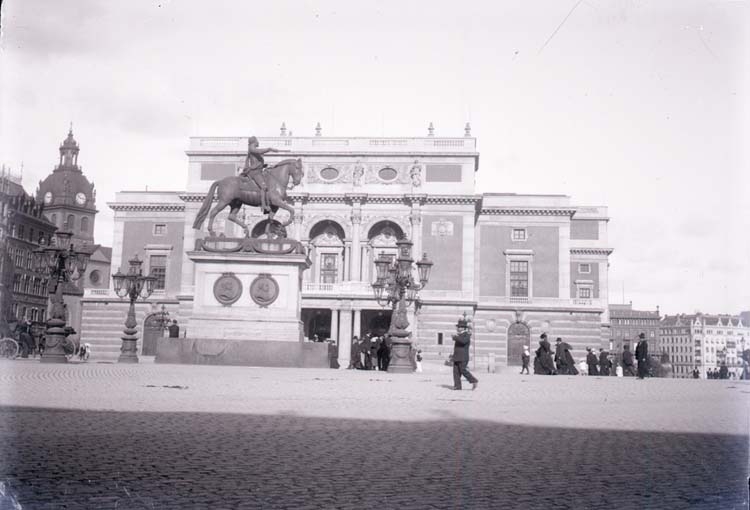 Enligt text som medföljde bilden: "Stockholm. Kungl. Operan o. Gustaf Adolfs staty. 2/9 1900."