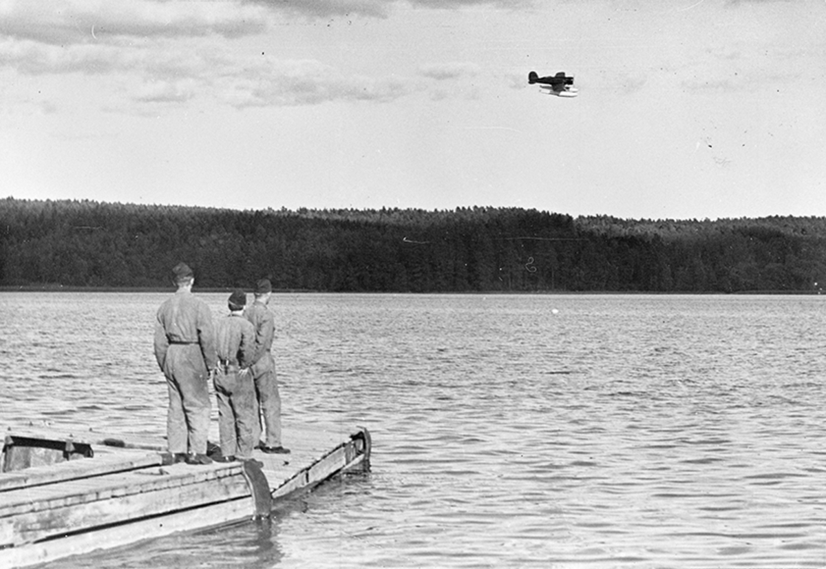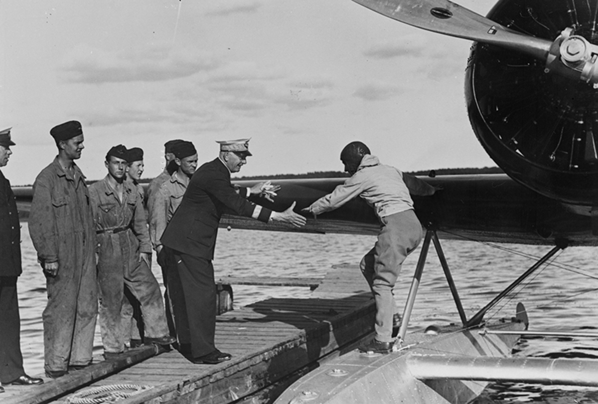 Charles Lindbergh och Anne Morrow Lindbergh flyger in för landning i sjöflygplanet Lockheed 8 Sirius vid besök på F 2. I förgrunden väntar tre militärer på en brygga.