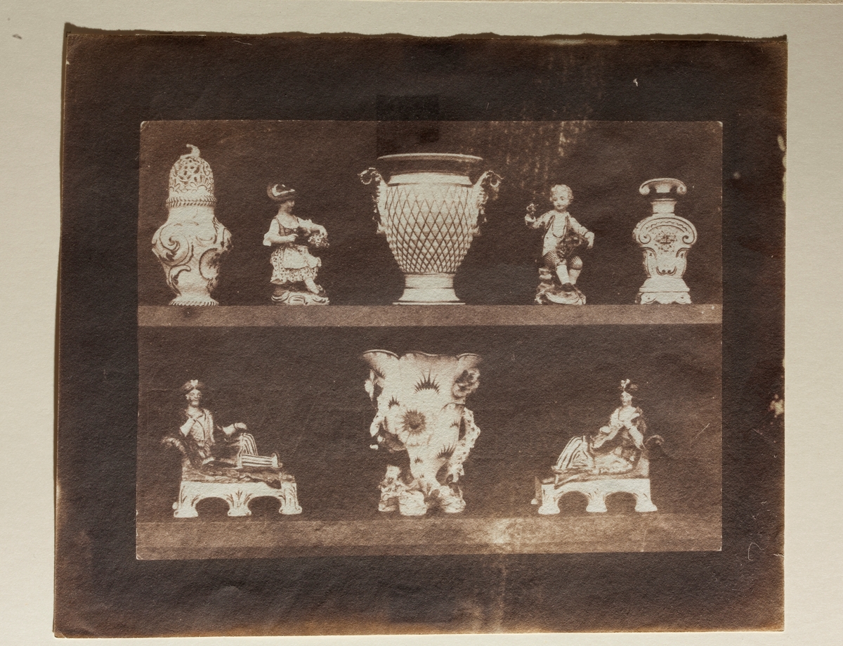 Originalkalotyp. "Porslin på två hyllor". Fotografiet är taget utomhus, på landet vid Lacock Abbey, troligen 1841/ 1842.
