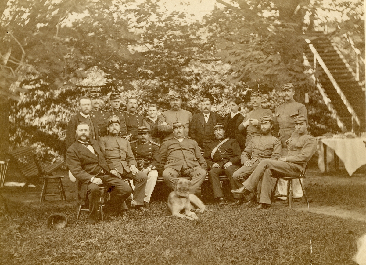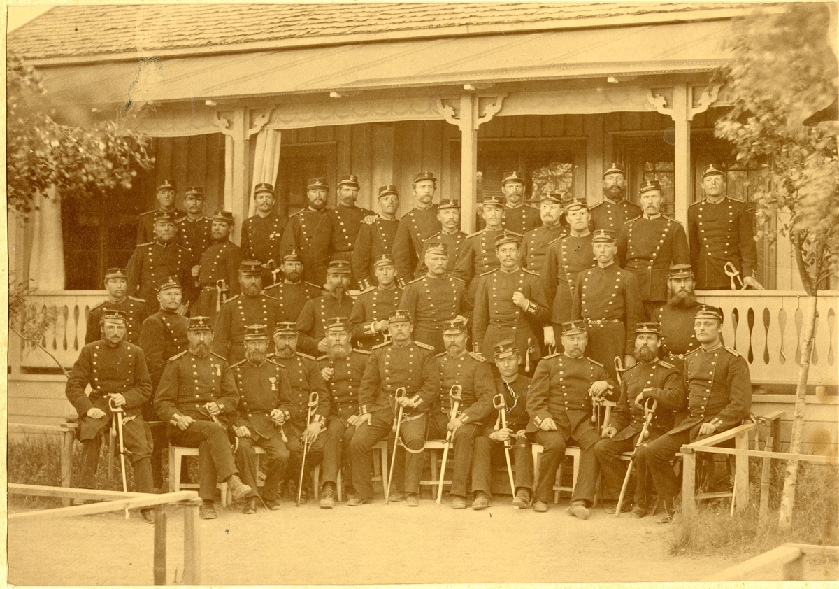 Grupporträtt av underofficerskåren vid Hälsinge regemente utanför officerspaviljongen Mohed 1882.