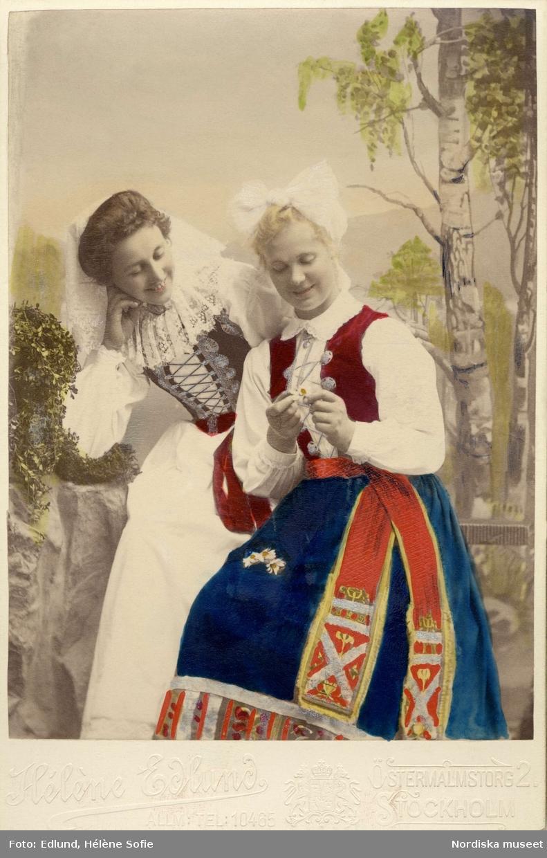 Ett handkolorerat foto på två kvinnor klädda i folkdräkt från Skåne eller Småland.