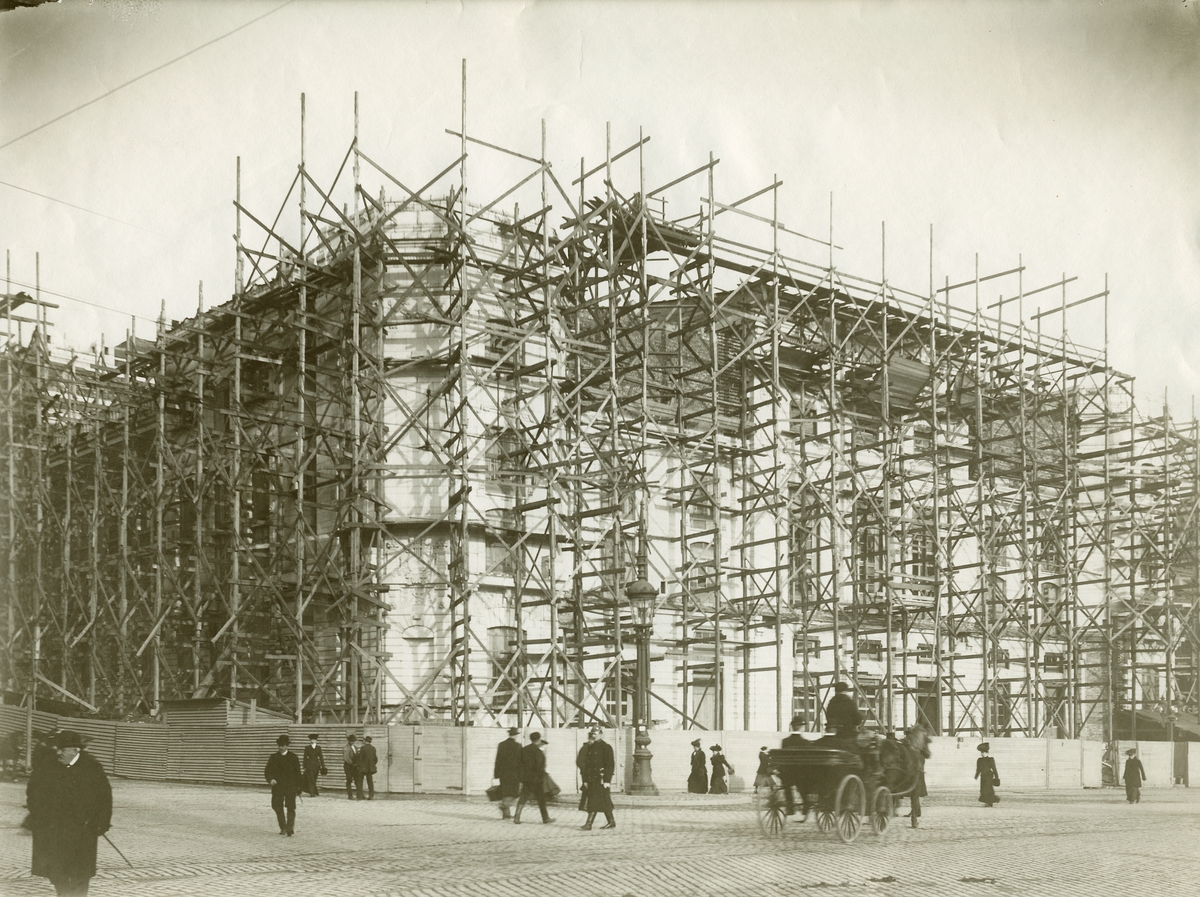 Foto från byggnationen av Dramatens jugendinspirerade nybyggnad (1901-1908) vid Nybroplan i Stockholm.
